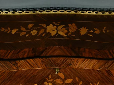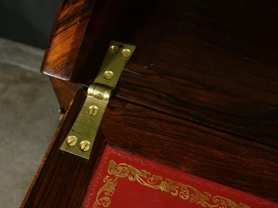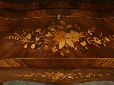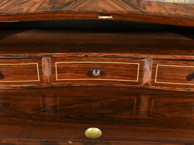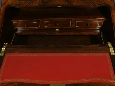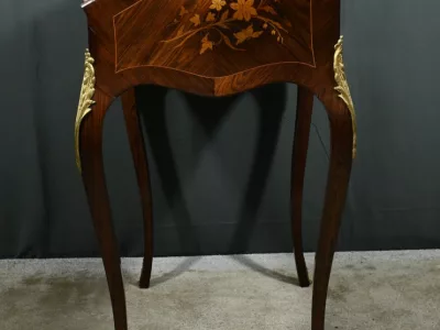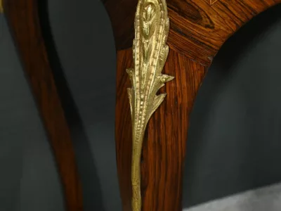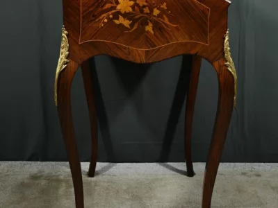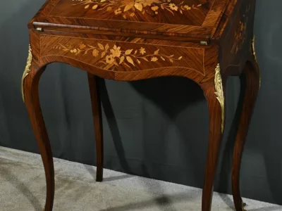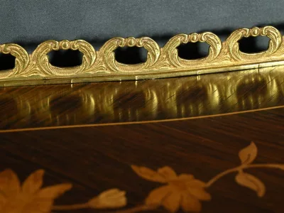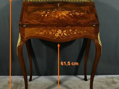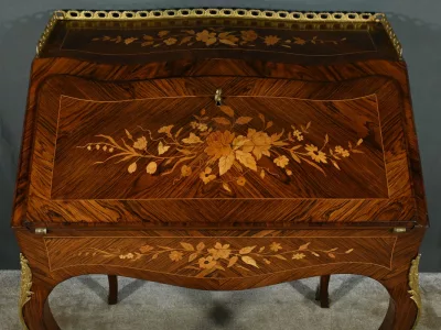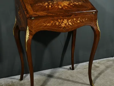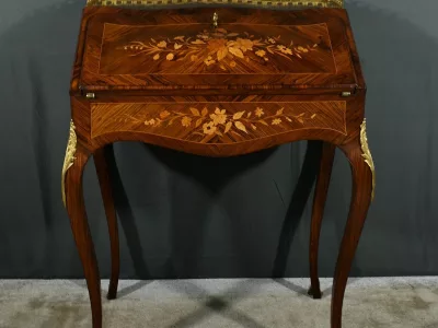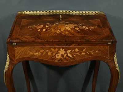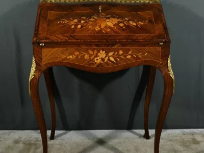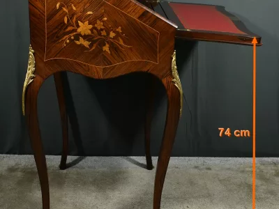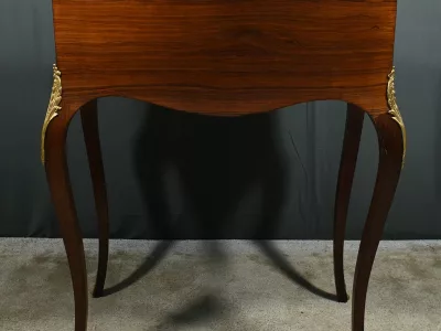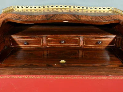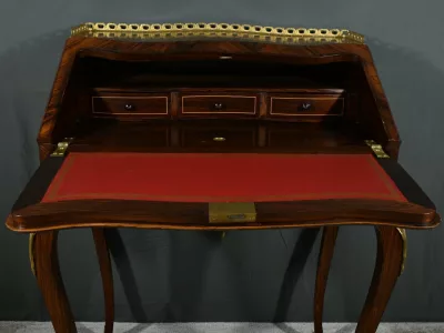 Damenschreibtisch im Louis XV-Stil mit schräger Platte und Intarsienarbeit aus Palisander. Innenausstattung mit späterer Schreibfläche aus rotem Leder. Bronzene Galerie. Ende des 19. Jahrhunderts. Ausgezeichneter Zustand. Kontaktieren Sie uns für die Lieferung. Referenz: 031224