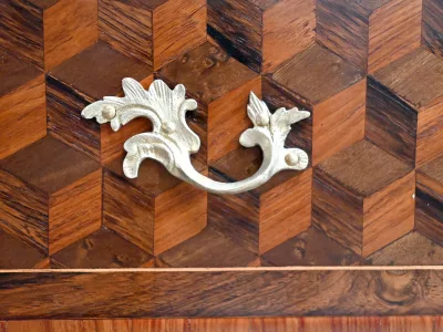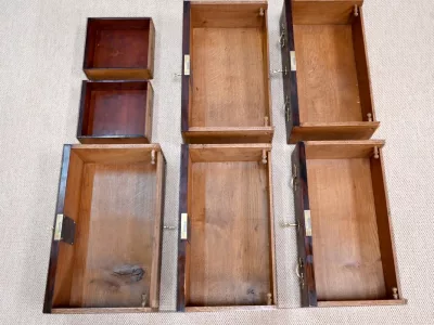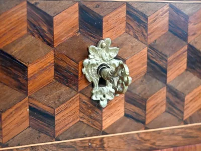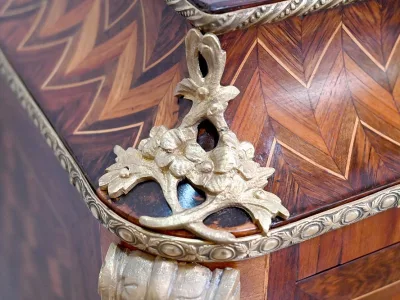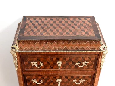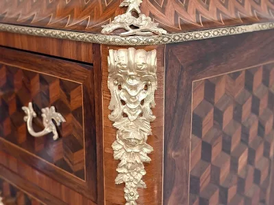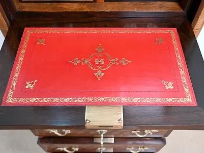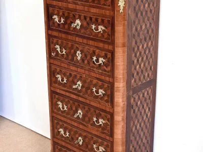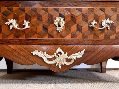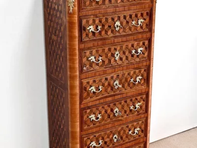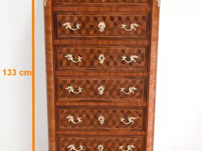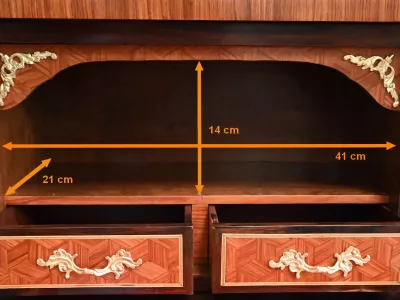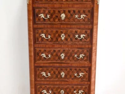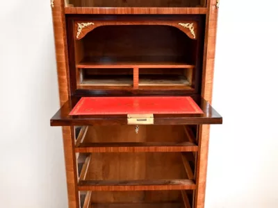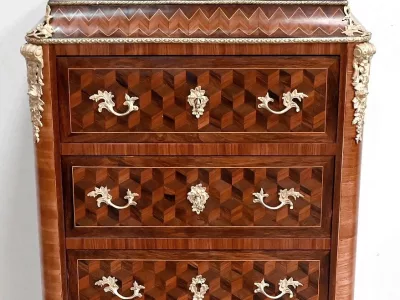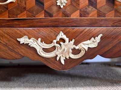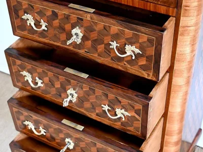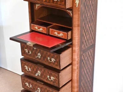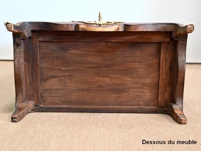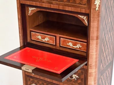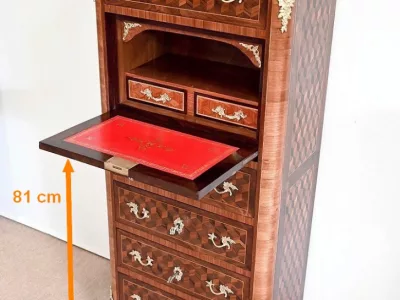 Sekretär im Louis XV-Stil in Intarsien, bestehend aus sieben Schubladen, von denen zwei ein Schreibfach mit passendem Innenraum und roter Lederschreibfläche bilden. Mitte 19. Jahrhundert. Hervorragender Zustand, gerieben und neu poliert. Kontaktieren Sie uns für die Lieferung. Referenz:070722 Bis