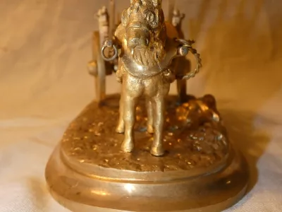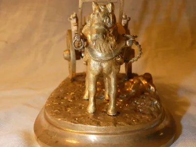 VERGOLDETE BRONZEFIGUR EINES PFERDES UND WAGENS