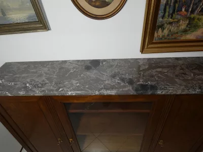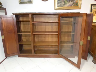 Ende des 19. bis Anfang des 20. Jahrhunderts, Stil Louis XVI, Bücherregal aus Mahagoni mit Marmorplatte. Guter Allgemeinzustand.