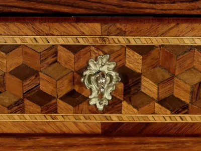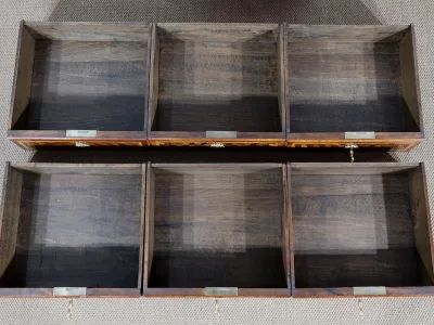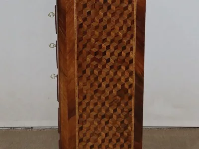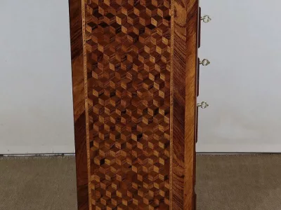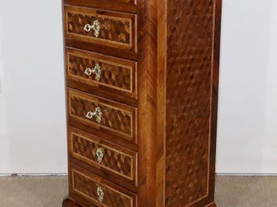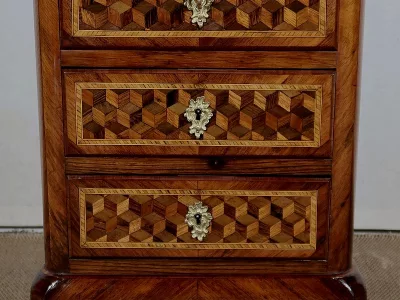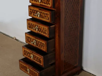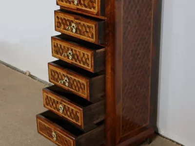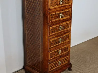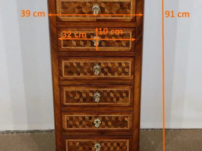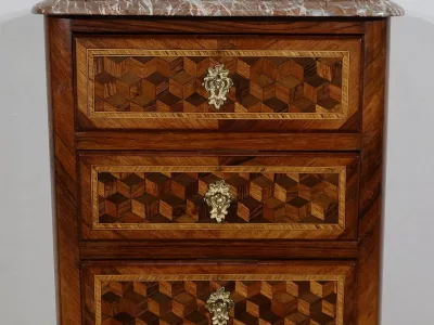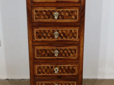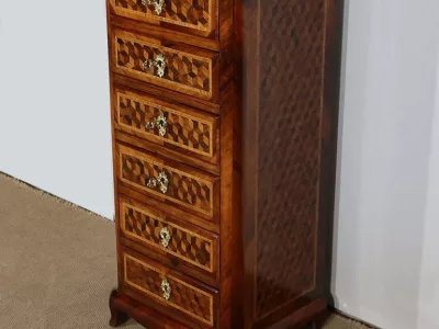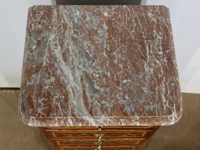 Kleine „Chiffonnier“-Kommode aus der Zeit Napoleons III. aus Palisander und Satinholz mit Marmorplatte. Bestehend aus sechs Intarsienschubladen mit bronzenen Schlüssellöchern und Originalschlössern mit späterem Schlüssel. In unserer Werkstatt restauriert und in ausgezeichnetem Zustand mit französischer Politur. Kontaktieren Sie uns für die Lieferung. Referenz: 30123 Viertel