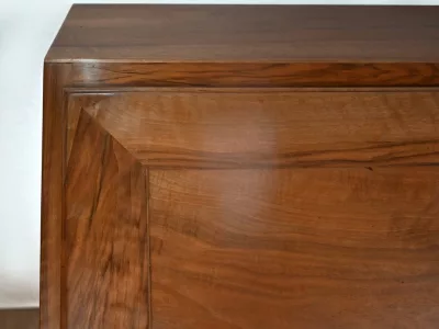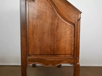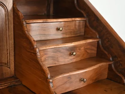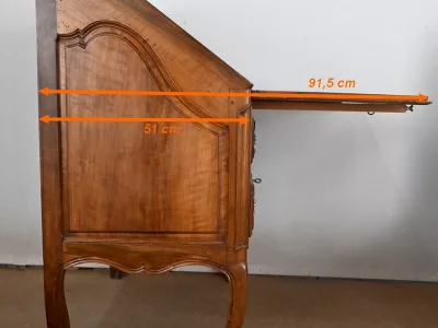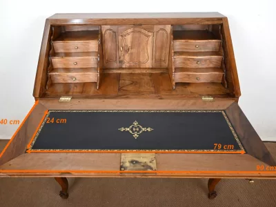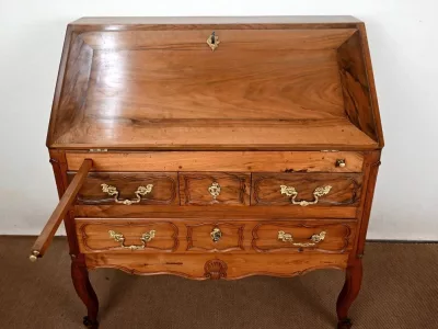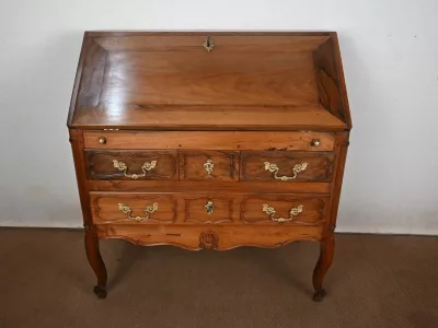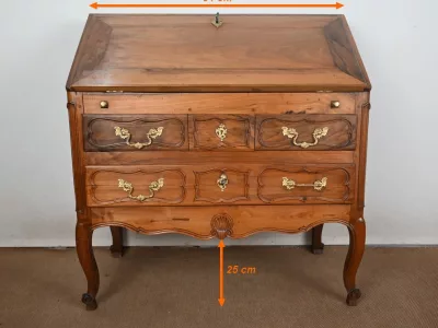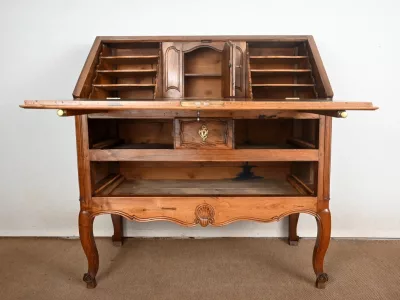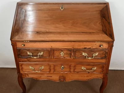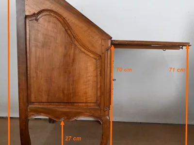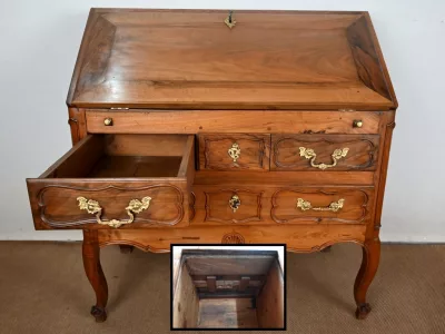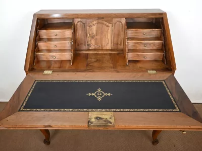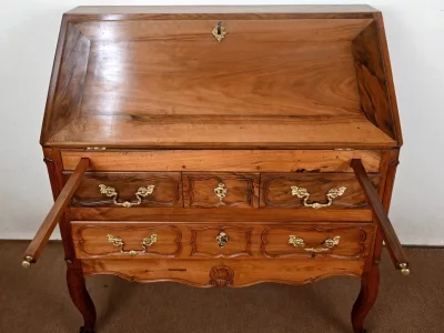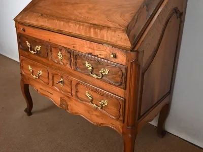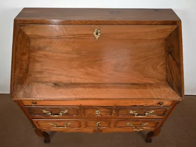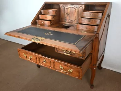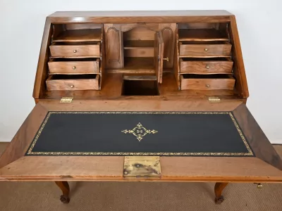 Louis XV Perios Schrägschreibtisch in Nussbaum mit passender Innenausstattung und schwarzer Lederschreibfläche. Ausgezeichneter Zustand mit einem einfachen Wachs-Finish. Kontaktieren Sie uns für die Lieferung. Referenz: 200922