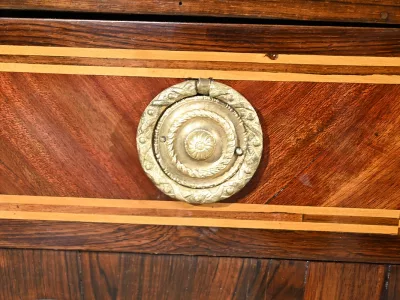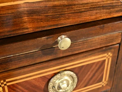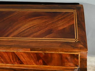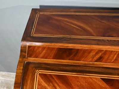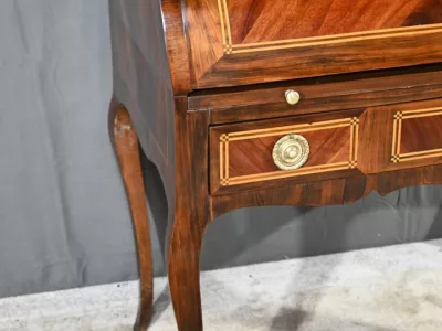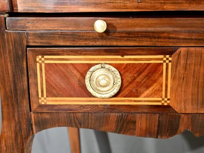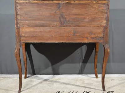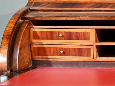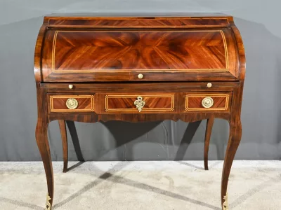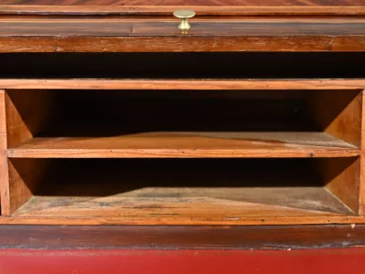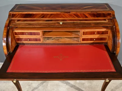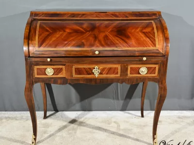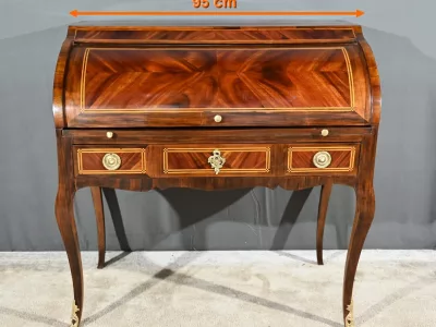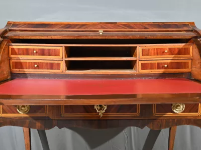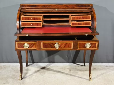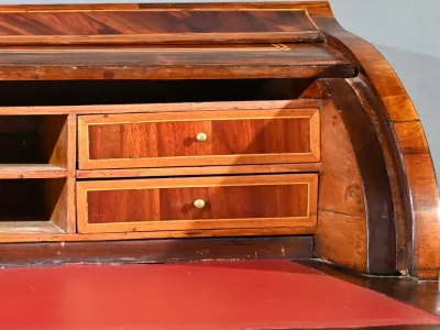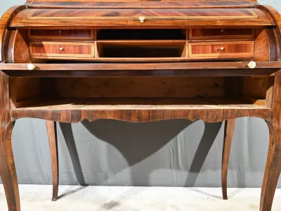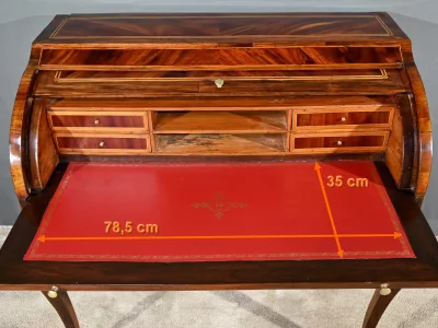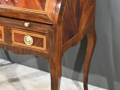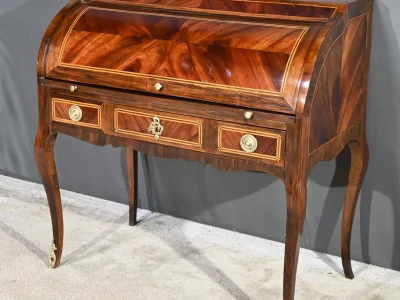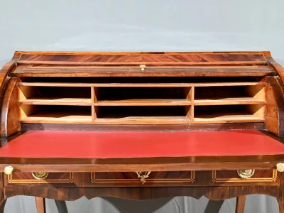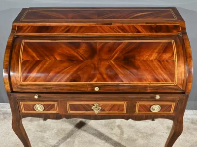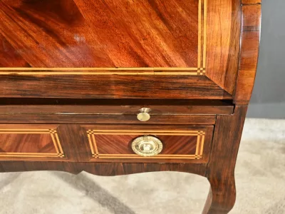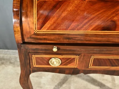 Schreibtisch aus der Zeit Ludwigs XV. mit Zylinderplatte aus Mahagoni und Palisander. Durch Öffnen des Zylinders gleitet eine Schreibfläche aus rotem Leder heraus. Sammlerstück. Ausgezeichneter Zustand. Kontaktieren Sie uns für die Lieferung. Referenz: 300424.3
