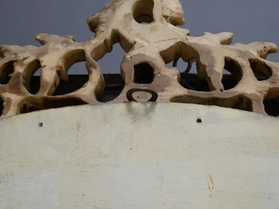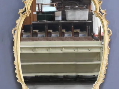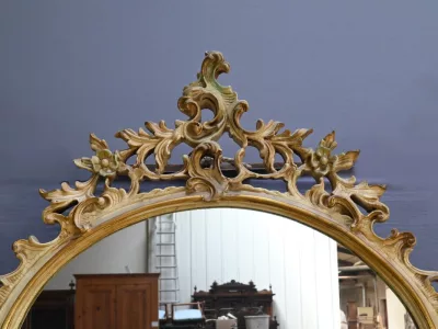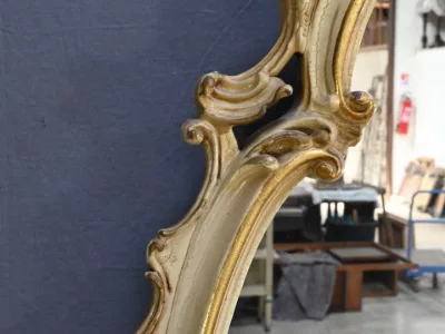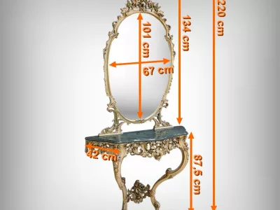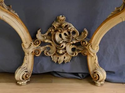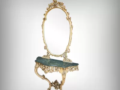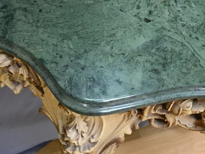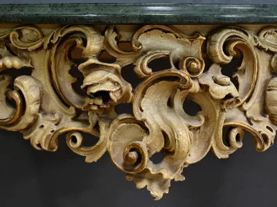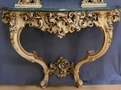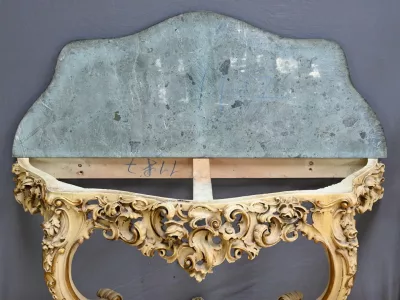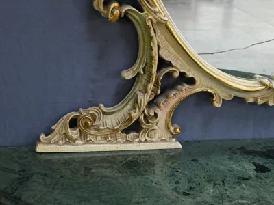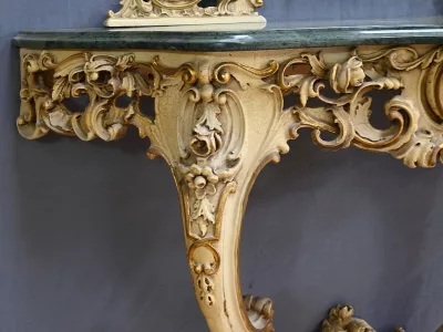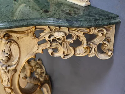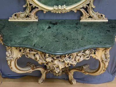 Konsolentisch im Rocaille-Stil aus dem 20. Jahrhundert mit Spiegel aus lackiertem Holz mit vergoldeten Akzenten. Grüne Marmorplatte. Perfekter Zustand (einige kleine Flecken auf dem Spiegel). Kontaktieren Sie uns für die Lieferung. Referenz: 318 V