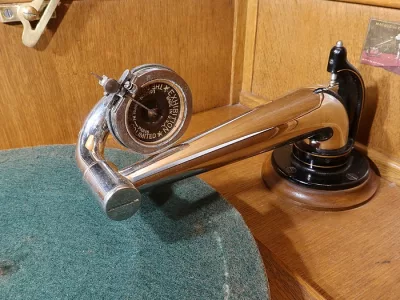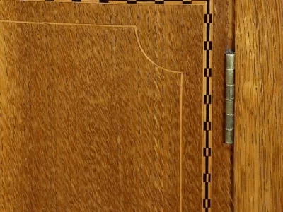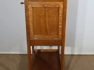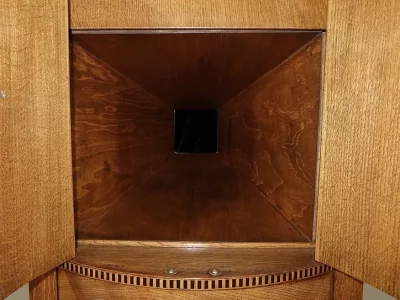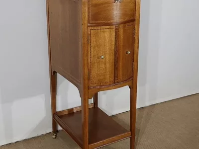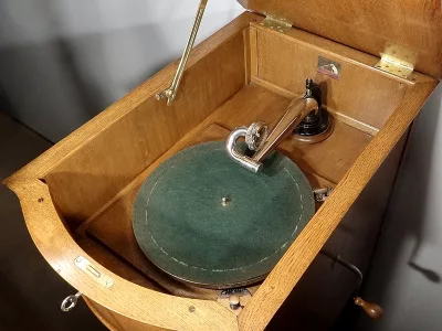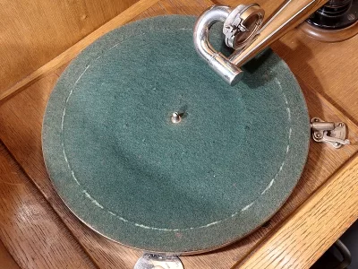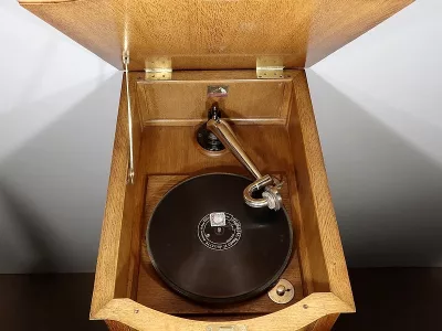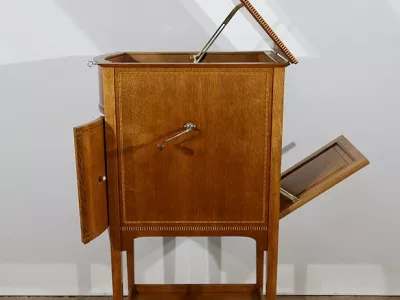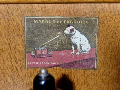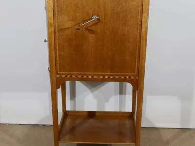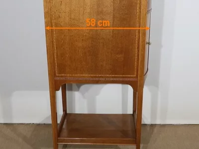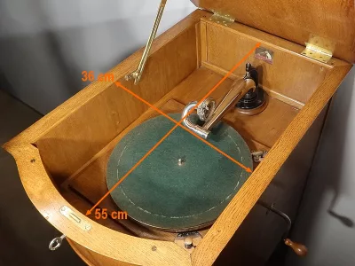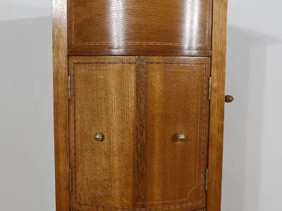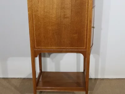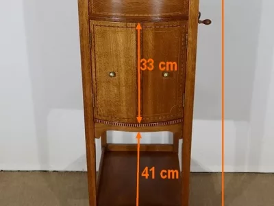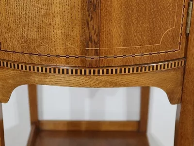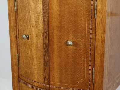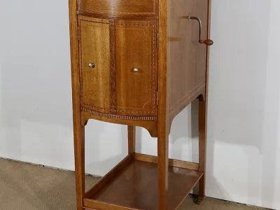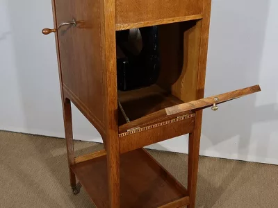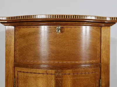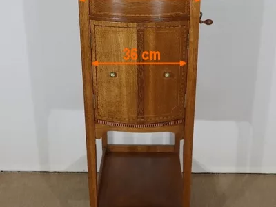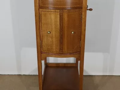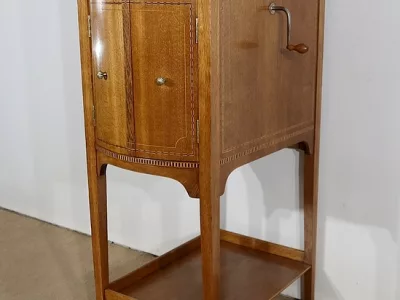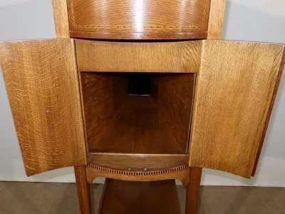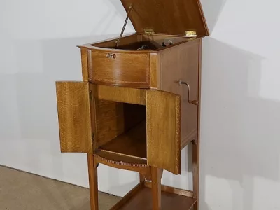 Musikschrank aus Eiche mit Intarsien aus Satinholz und Ebenholz, enthält ein Grammophon in einwandfreiem Zustand. Signiert "The Gramophone Co. Limited - Made in USA". Anfang des zwanzigsten Jahrhunderts. In unserer Werkstatt restauriert und in ausgezeichnetem Zustand. Kontaktieren Sie uns für die Lieferung. Referenz: 362 T