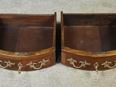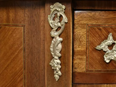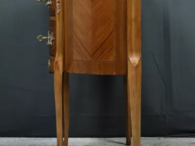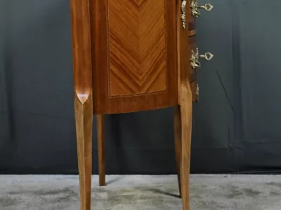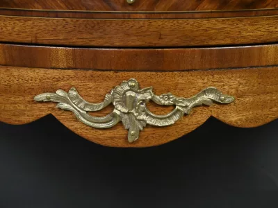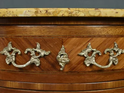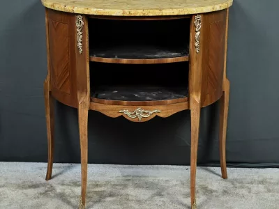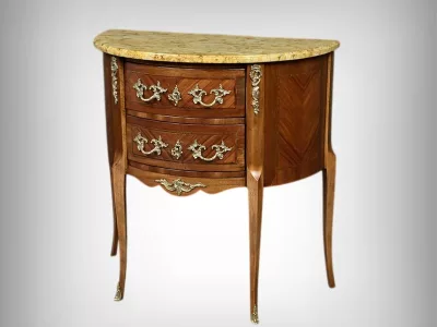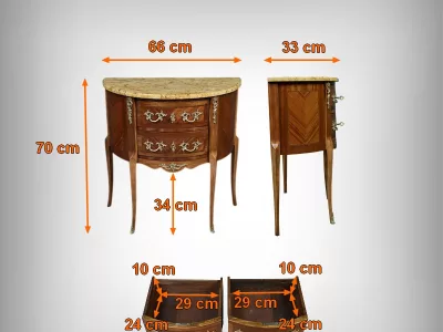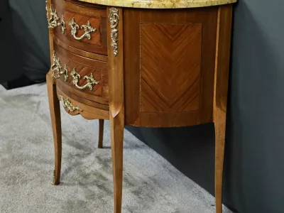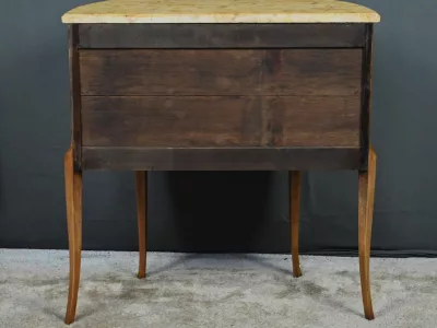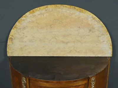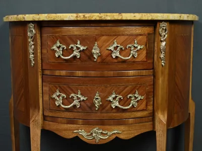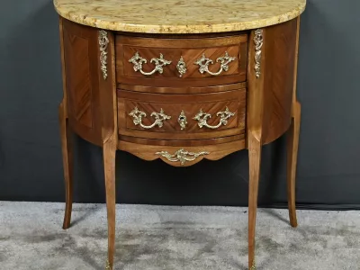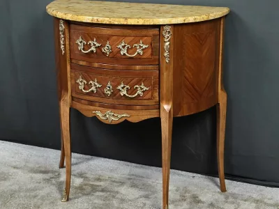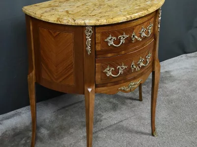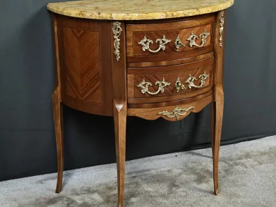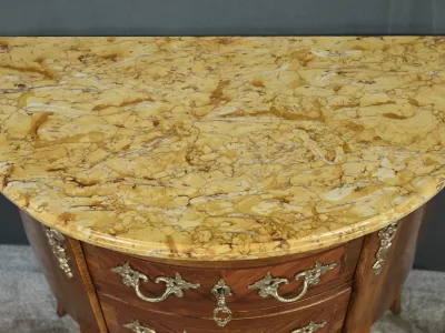 Kommode im Übergangsstil (frühes 20. Jahrhundert) in Form einer Halbmondkommode aus Mahagoni und Palisander mit Intarsien, Marmorplatte und vergoldeten Bronzebeschlägen. In unserer Werkstatt restauriert und in exzellentem Zustand mit Schellackpolitur. Lieferung auf Anfrage. Referenz: 431 V