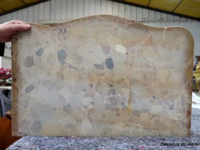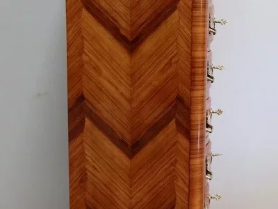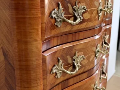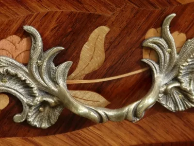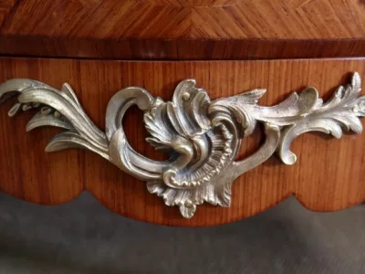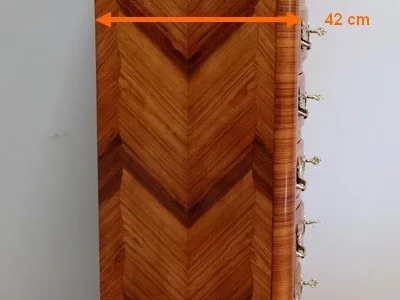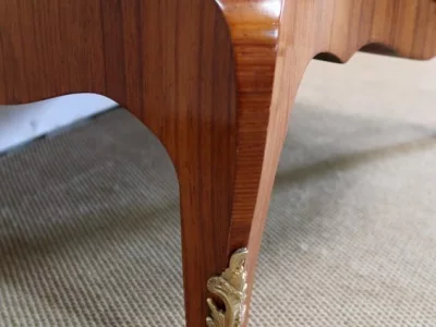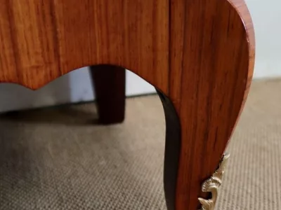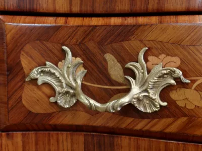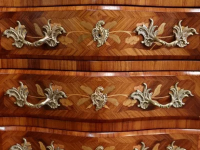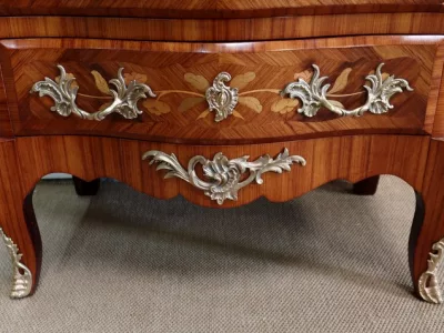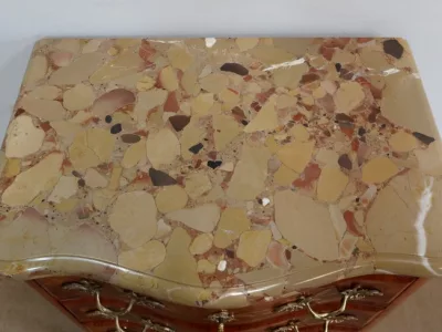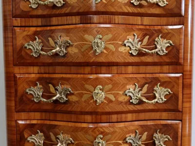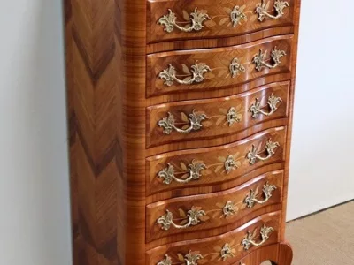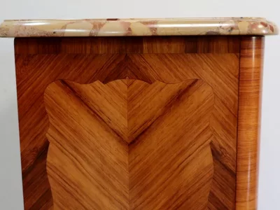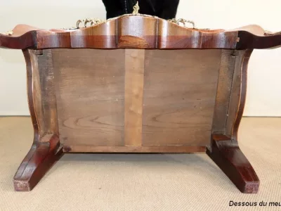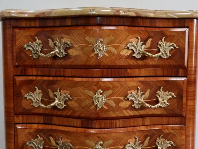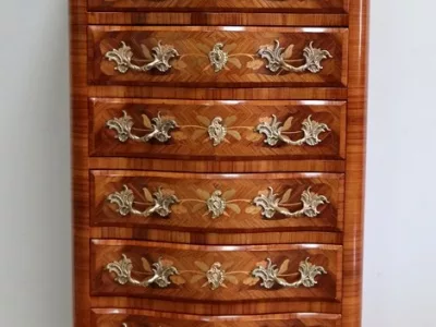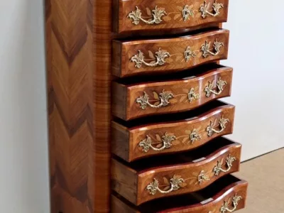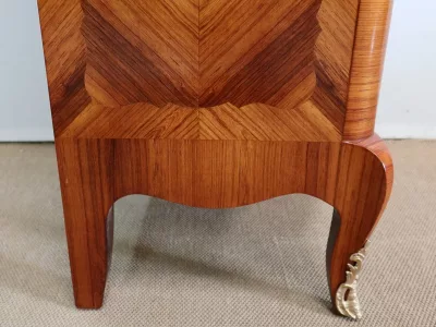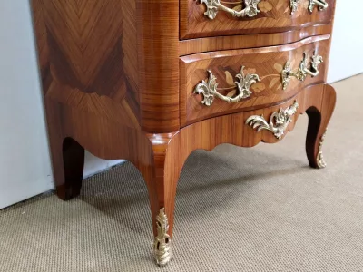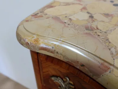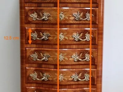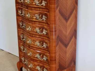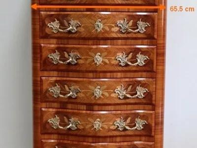 "Semainier"-Kommode aus dem frühen 20. Jahrhundert im Louis XV-Stil mit Amaranth-Furnier und Intarsien mit Marmorplatte. Sieben Schubladen mit Bronzegriffen und Schlüssellöchern, komplett mit Originalschlüssel. In unserer Werkstatt restauriert und in ausgezeichnetem Zustand. Kontaktieren Sie uns für die Lieferung. Referenz: 592 T