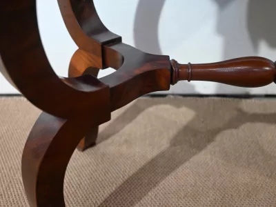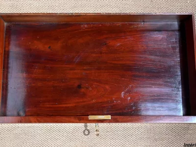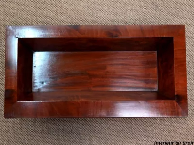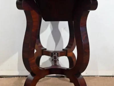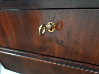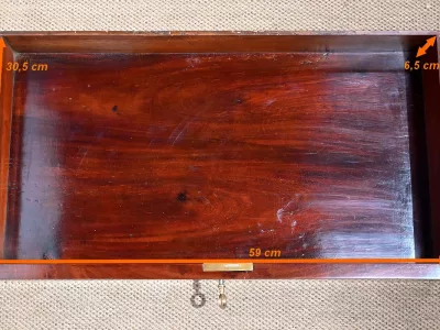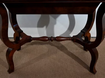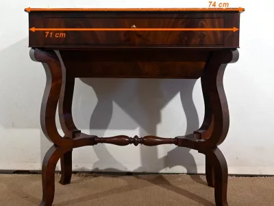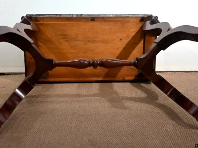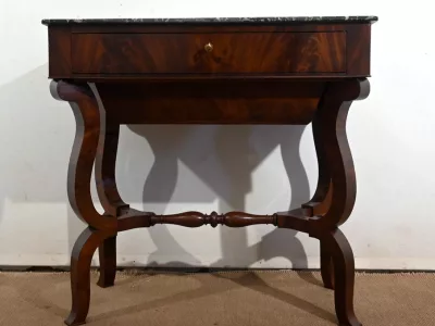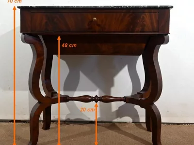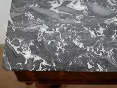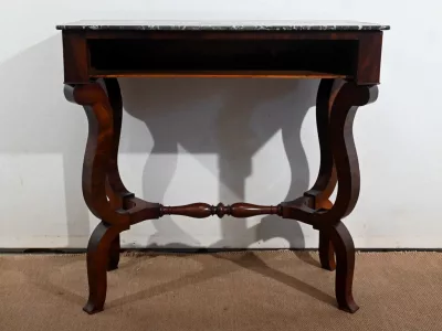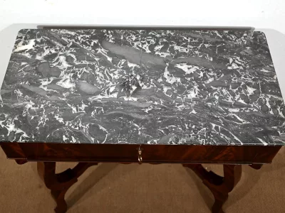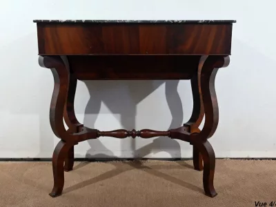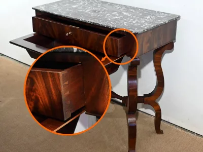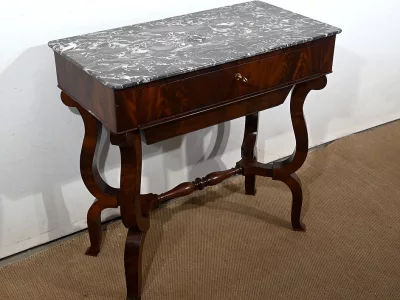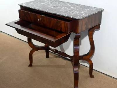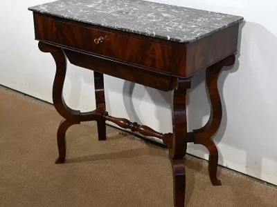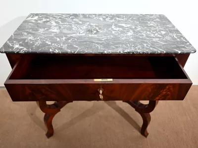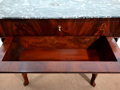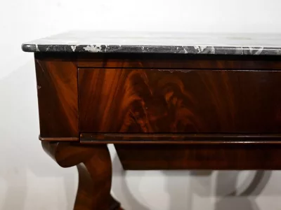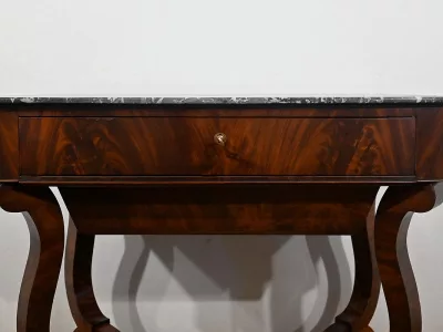 Konsolentisch aus der Restaurierungszeit in Mahagonifurnier mit Marmorplatte. Friesschublade mit originalem Schloss. Kontaktieren Sie uns für die Lieferung. Referenz: 64 S