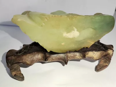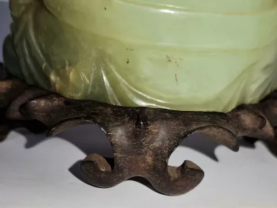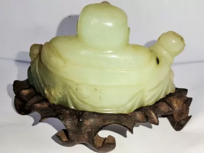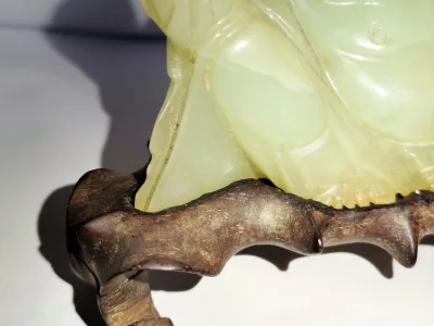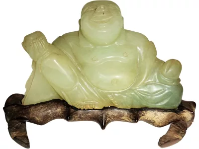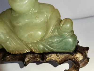 Chinesische Buddha-Statuette aus Jade, auf Holzsockel. Um 1930.