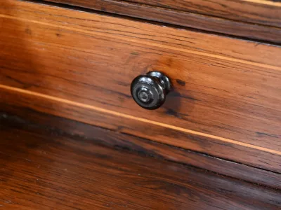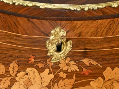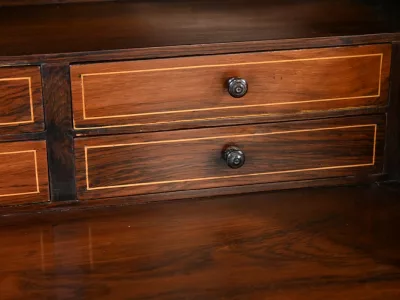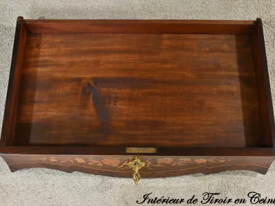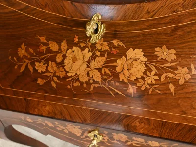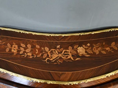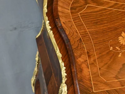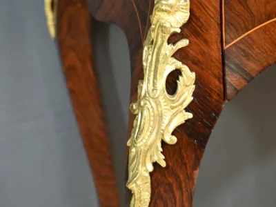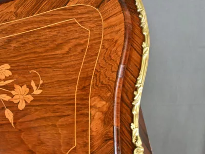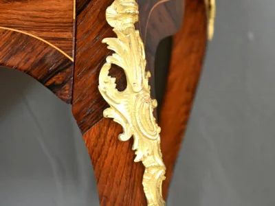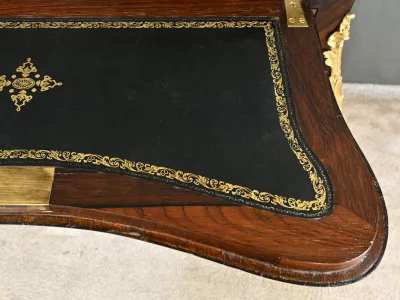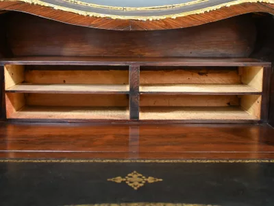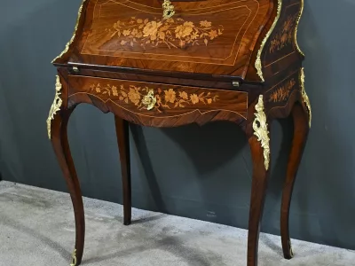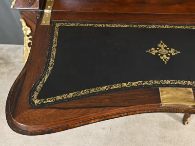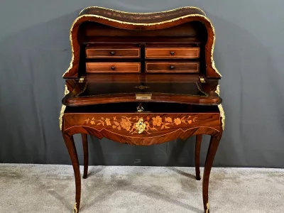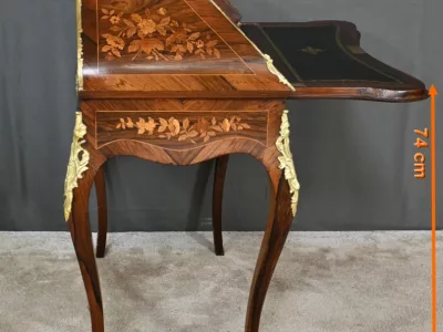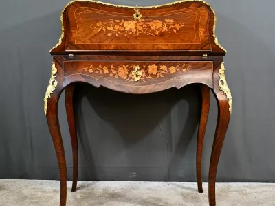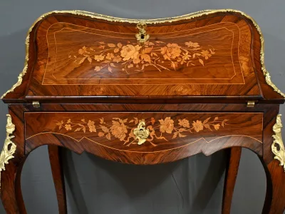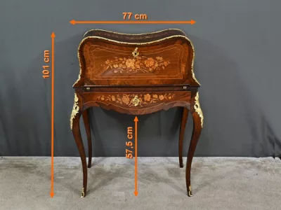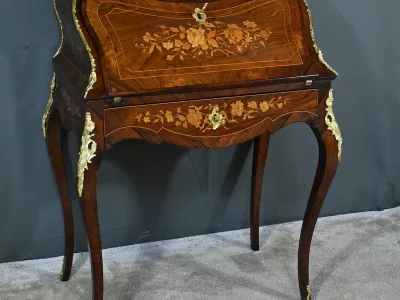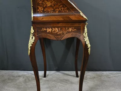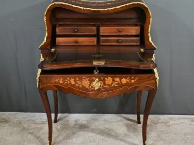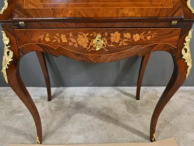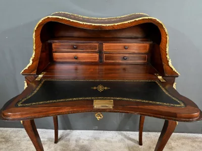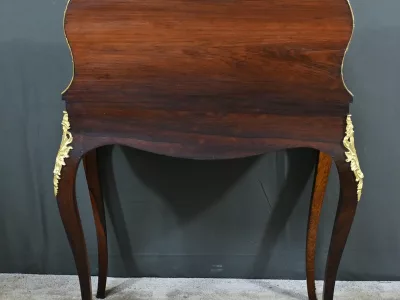 Kleiner Damenschreibtisch im Louis-XV-Stil aus Palisanderholz mit Intarsienarbeit. Klappe auf einem Innenteil mit späterer Schreibfläche aus schwarzem Leder. Große Friesschublade. Ende des 19. Jahrhunderts. Ausgezeichneter Zustand. Kontaktieren Sie uns für die Lieferung. Referenz: 94 V