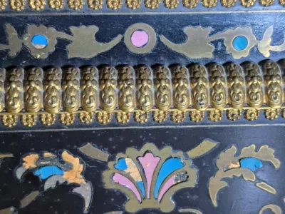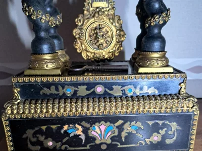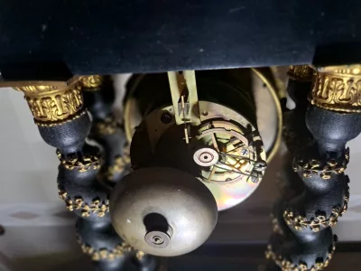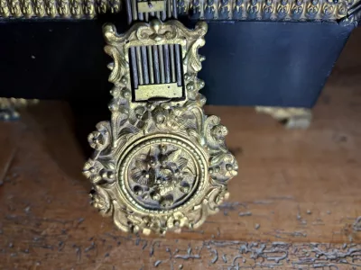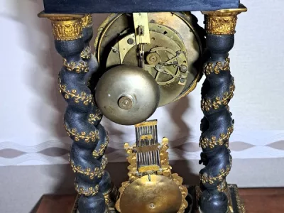 Portikusuhr aus der Zeit Napoleons III. mit Boulle-Intarsien. Bewegung braucht Aufmerksamkeit.