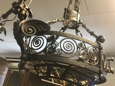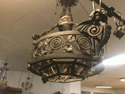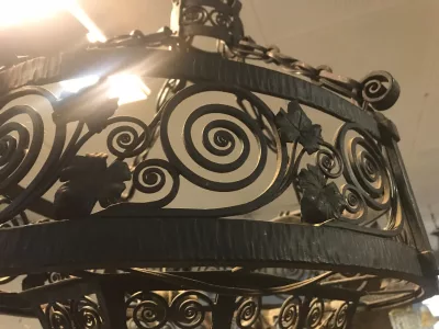 Prächtige schmiedeeiserne Deckenleuchte von Charles Piguet (1887-1942). Das Glas fehlt.
