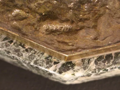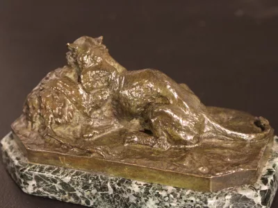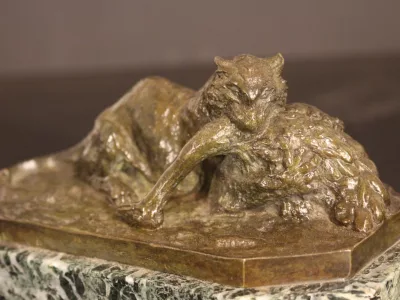 Bronzeskulptur eines Löwen, der einen Strauß angreift. Marmorsockel. Unleserliche Signatur auf der Rückseite.