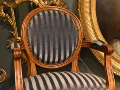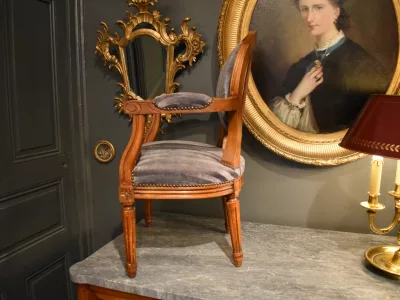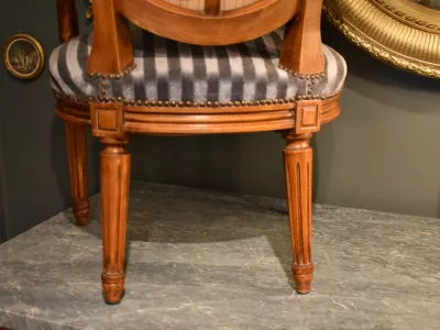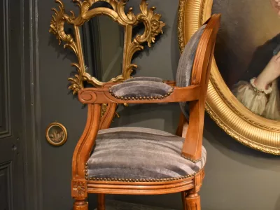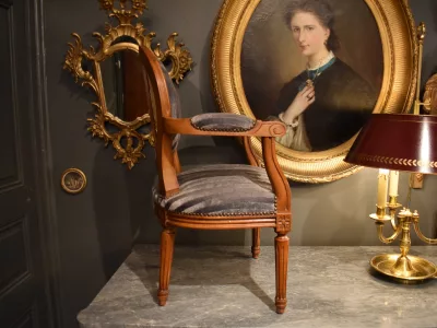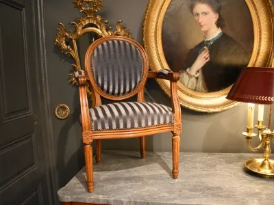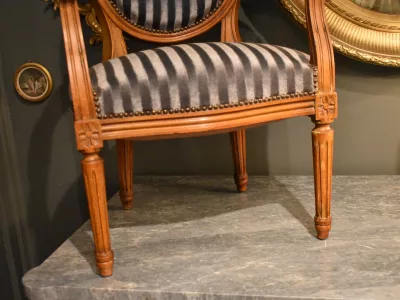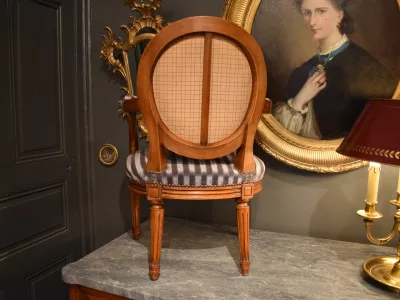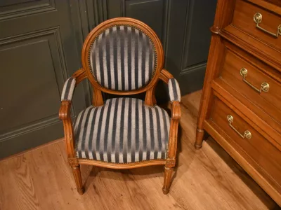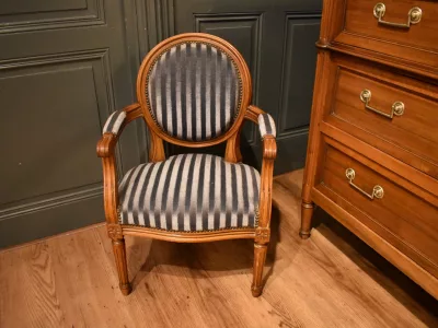 Fauteuil d'enfant de style Louis XVI dossier médaillon, la garniture et le tissu de couverture sont en très bon état. Hauteur d'assise : 34 cm. Envoi possible. Chaque demande de renseignements par mail fera l'objet d'une réponse, merci de contrôler les messages indésirables.