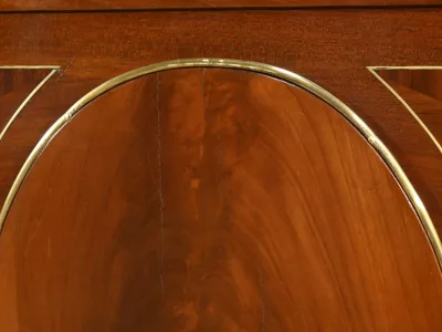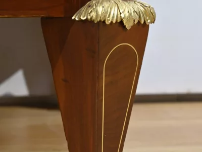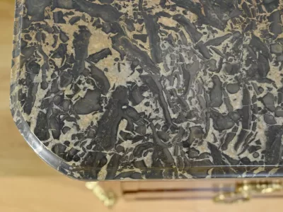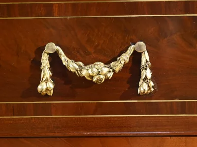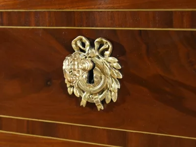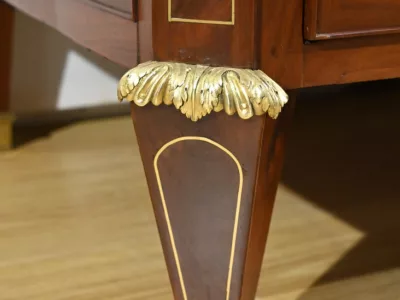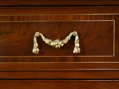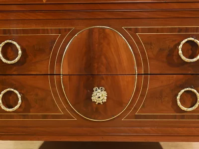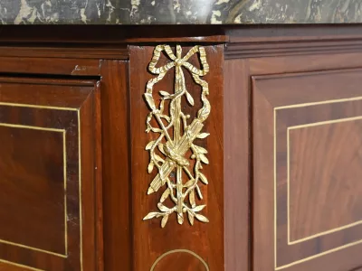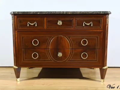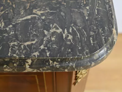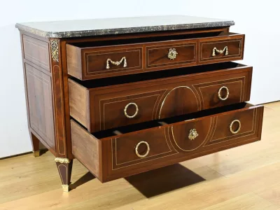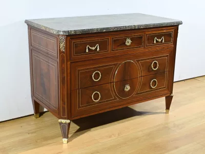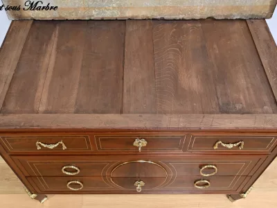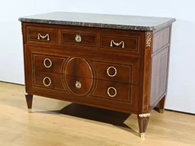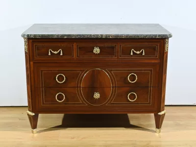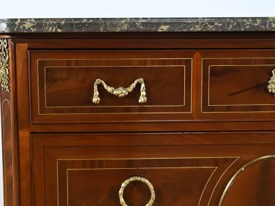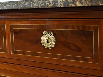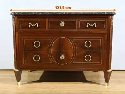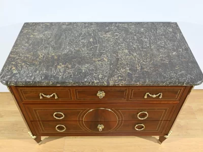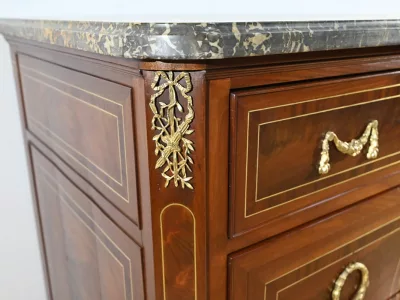 Cómoda de época Luis XVI en caoba con marquetería de latón y sobre de mármol. Tiradores, bocallaves y decoración en bronce. Excelente estado de conservación. Contáctenos para su entrega. Referencia: 070524.3
