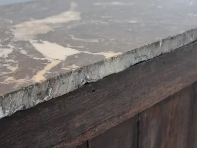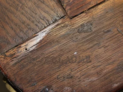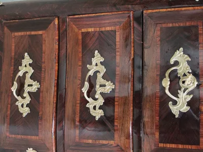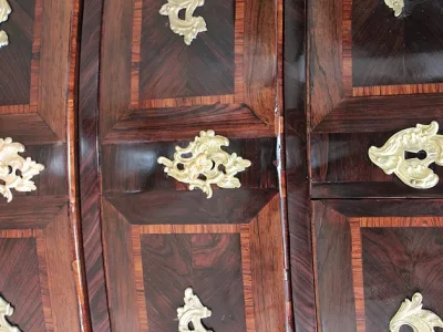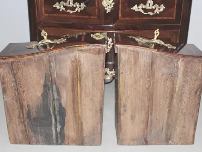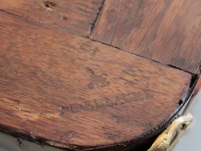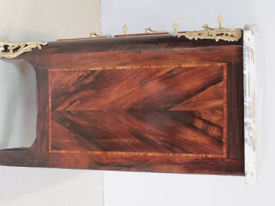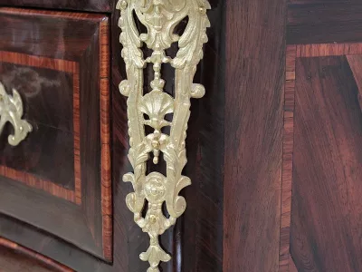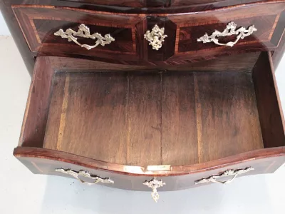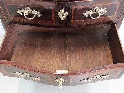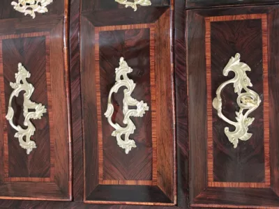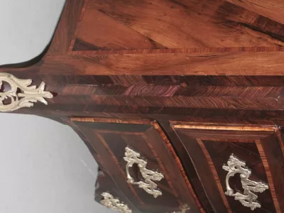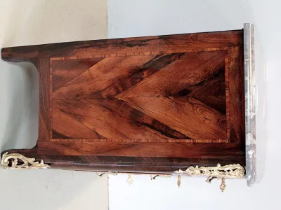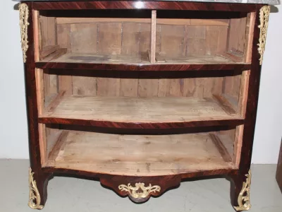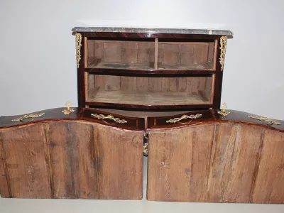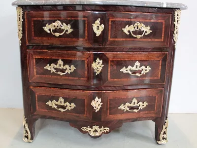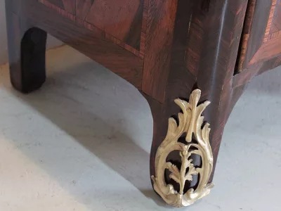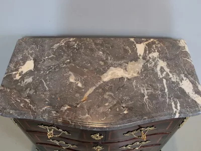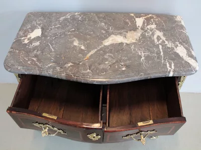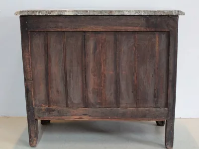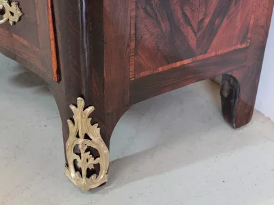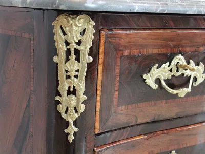 Cajonera de época de transición en marquetería de palisandro y kingwood con cuatro cajones en tres filas. Frente en forma. Tapa de mármol gris. Atractivo bronce original excepto por las llaves. Oak atrás. Firmado en dos lugares "JC ELLAUME" y con el sello distintivo de Jurande (Jean Charles Ellaume, fabricante de armarios maestro registrado en 1754. Restaurado y en muy buenas condiciones (las llaves han sido reemplazadas) con acabado polaco francés.