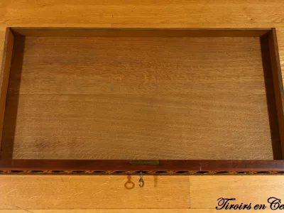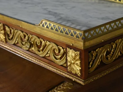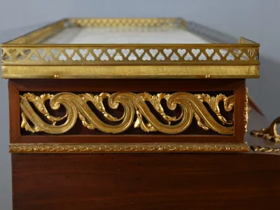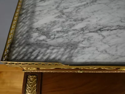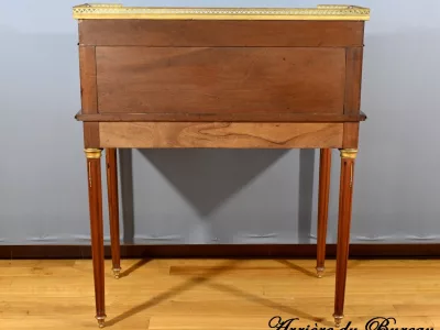 Escritorio pequeño estilo Luis XVI con tapa cilíndrica en caoba, tablero de mármol y galería de latón. Interior equipado con superficie de escritura nueva de cuero negro. Finales del siglo XIX. Excelente estado. Contáctenos para entrega. Referencia: 129 N
