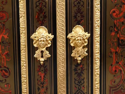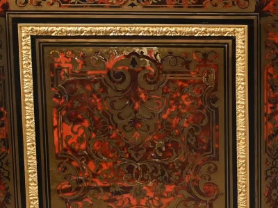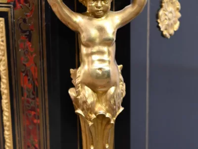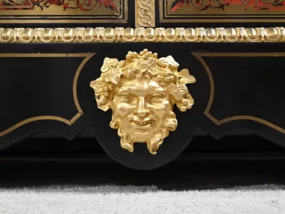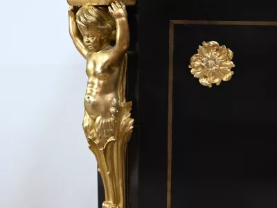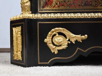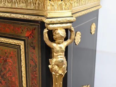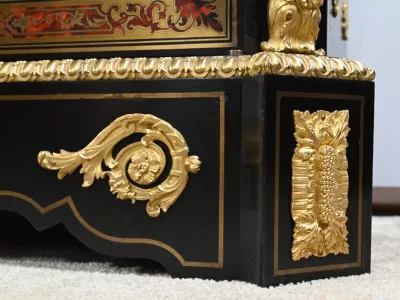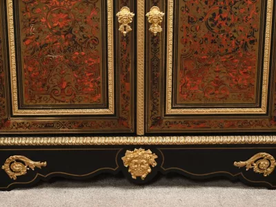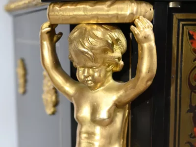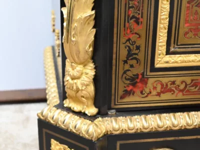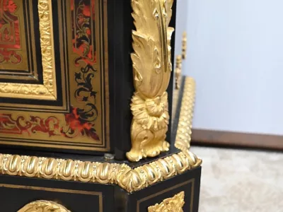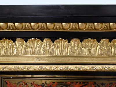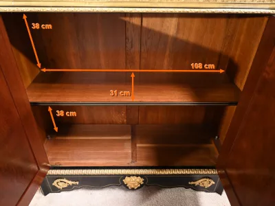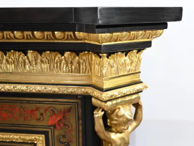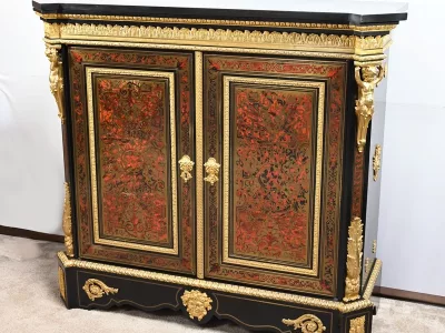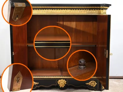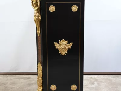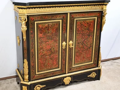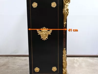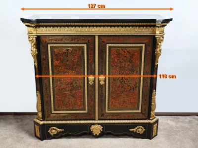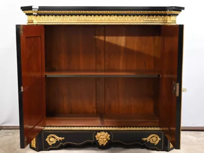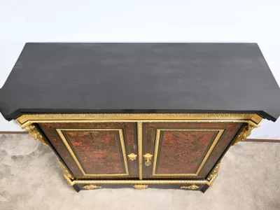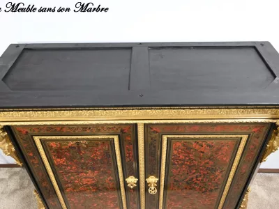 Mueble de época Napoleón III en madera de frutos negros y marquetería Boulle con incrustaciones de bronce y latón. Tapa de mármol negro. Excelente condición. Acabado pulido francés. Se desmonta para el transporte. Certificado de autenticidad suministrado. Contáctenos para la entrega. Referencia: 190923.3