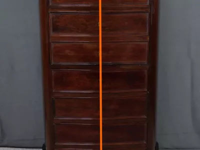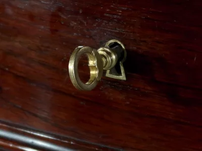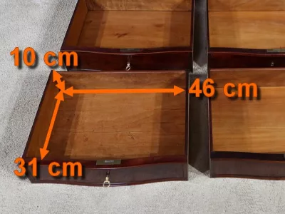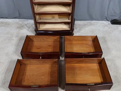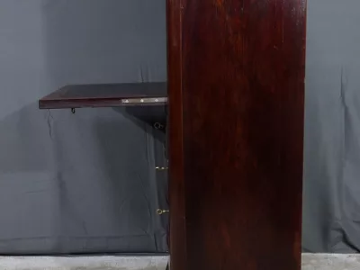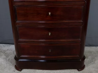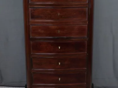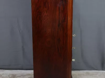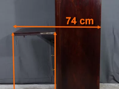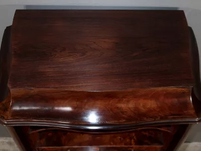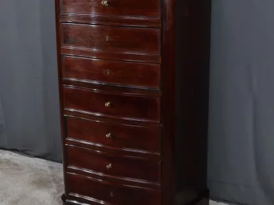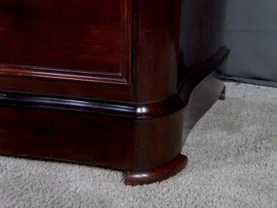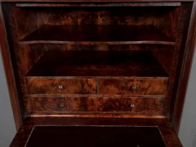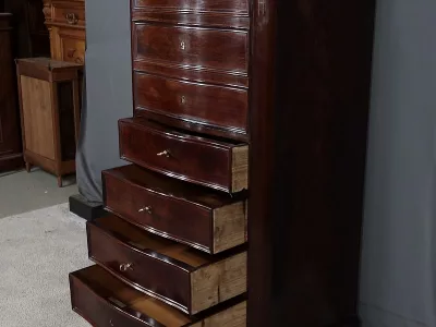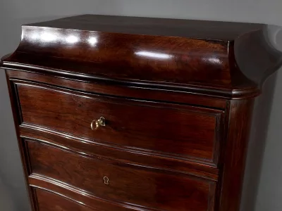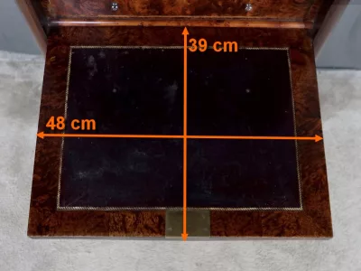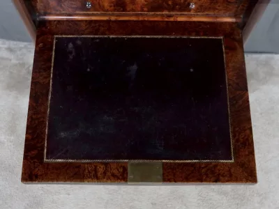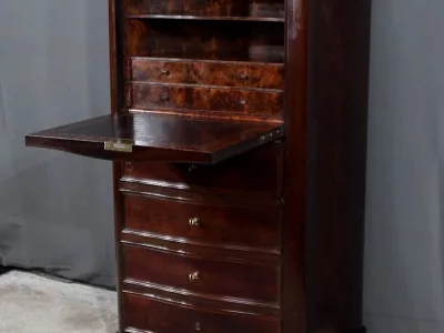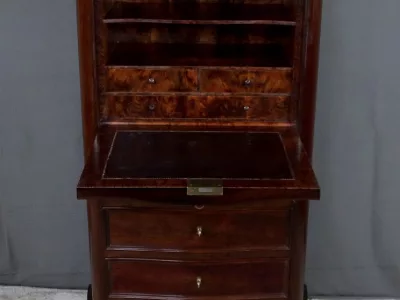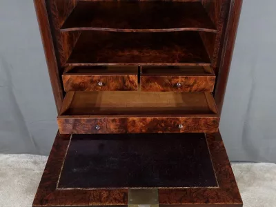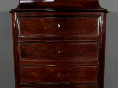 Cómoda de estilo Napoleón III en madera de palisandro con interior de tuya. La hoja abatible está formada por tres cajones de imitación, con cuatro cajones auténticos en la parte inferior. Cerraduras y llaves originales. Interior equipado con superficie de escritura de cuero negro. Excelente estado. Restaurada en nuestro taller. Acabado a la cera sobre superficie dura. Contáctenos para su entrega. Referencia: 200424.2