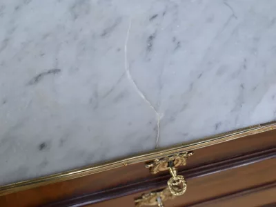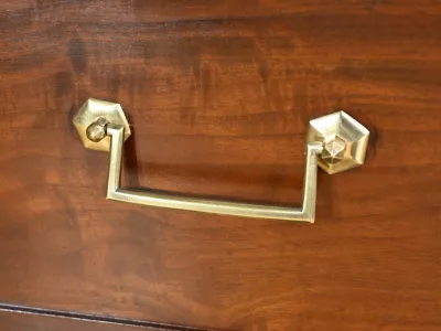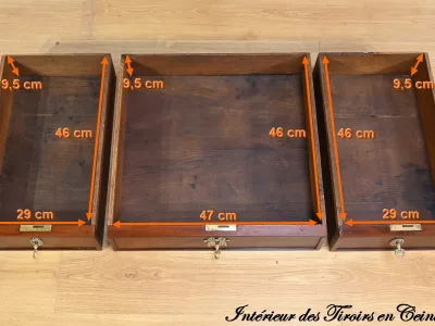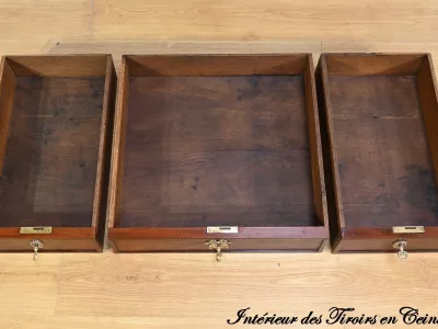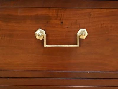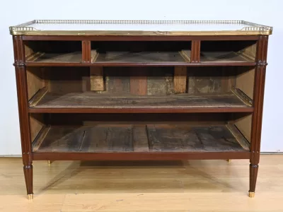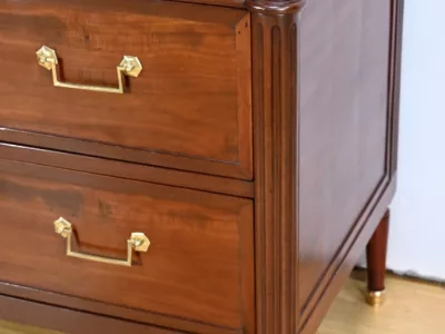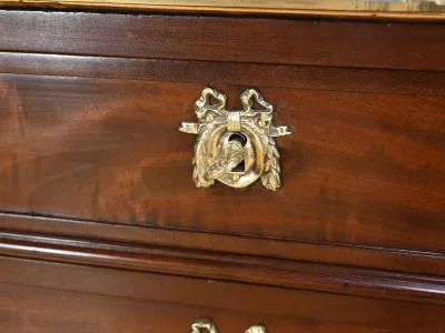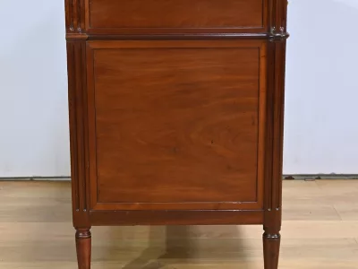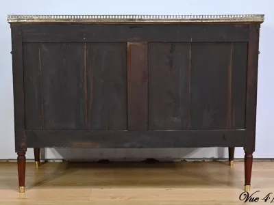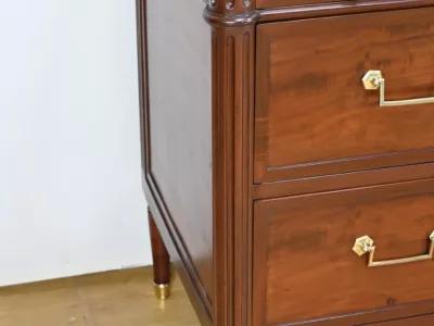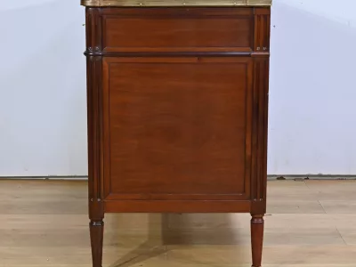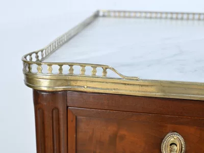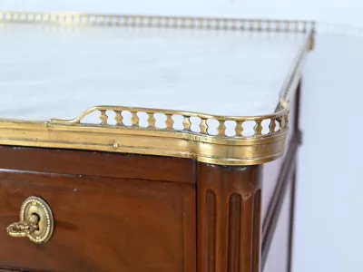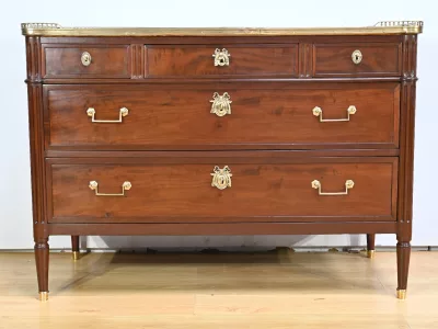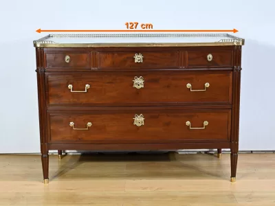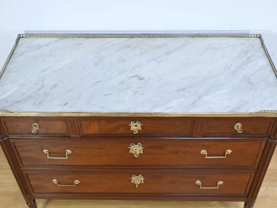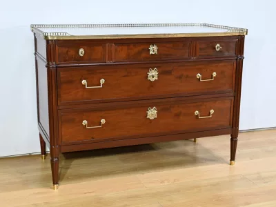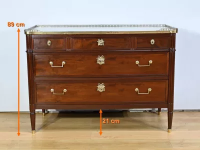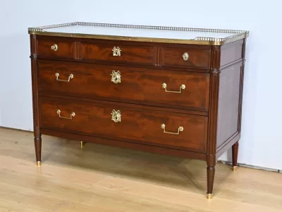 Cómoda de época Luis XVI en caoba con tapa de mármol y galería de latón. Tres cajones con friso y dos cajones más grandes, todos con sus cerraduras y llaves auténticas. Excelente condición. Acabado en cera. Contáctenos para la entrega. Referencia: 240524.5