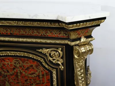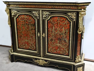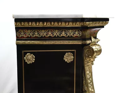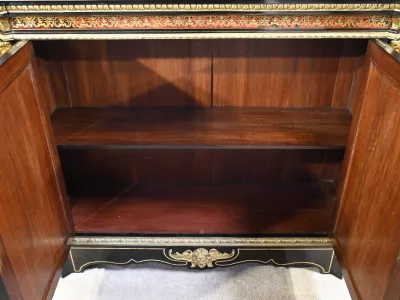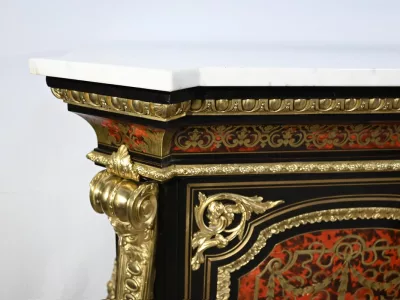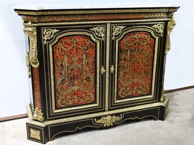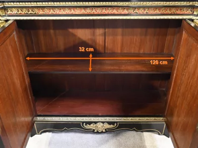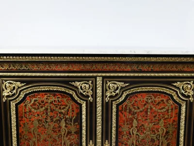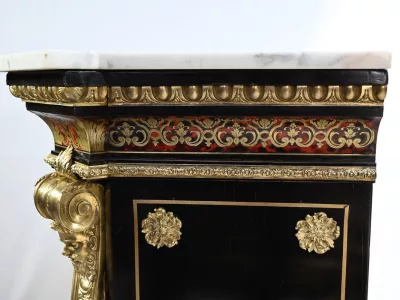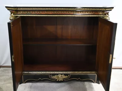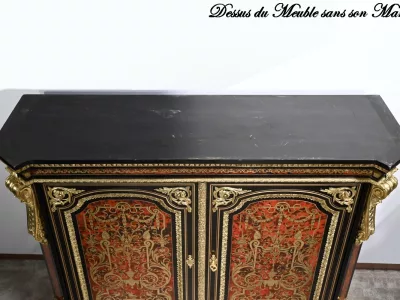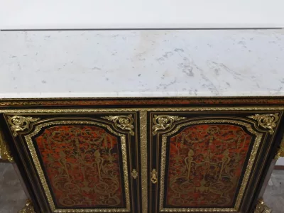 Buffet de época Napoleón III en madera de frutos negros y marquetería Boulle con rica decoración en bronce dorado y latón. Tapa de mármol blanco. Interior de caoba con estante. Certificado de autenticidad suministrado. Excelente condición. Acabado pulido francés. Se desmonta para el transporte. Contáctenos para la entrega. Referencia: 250723