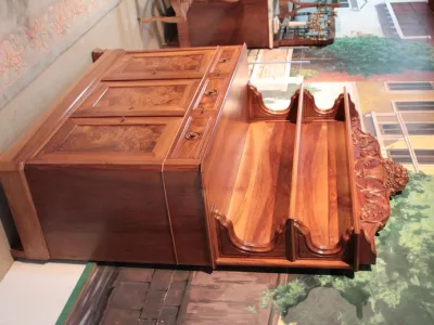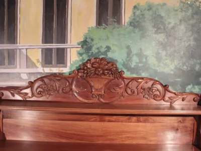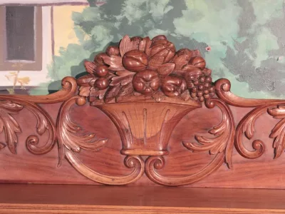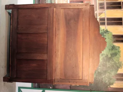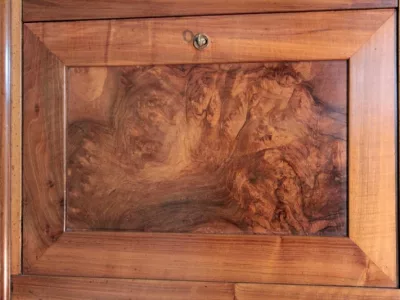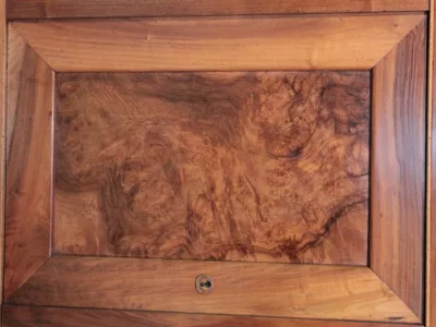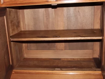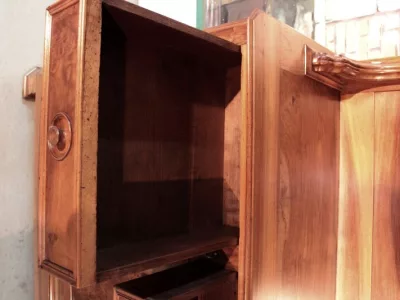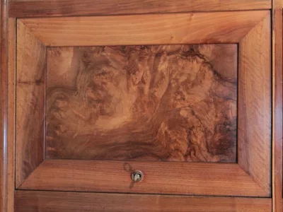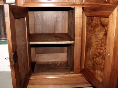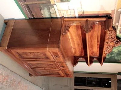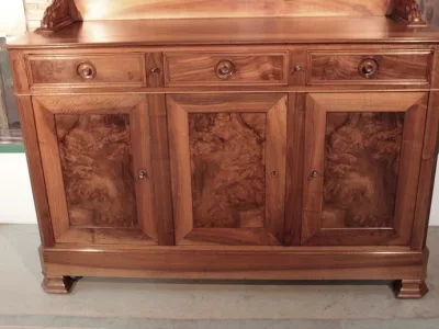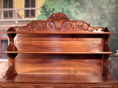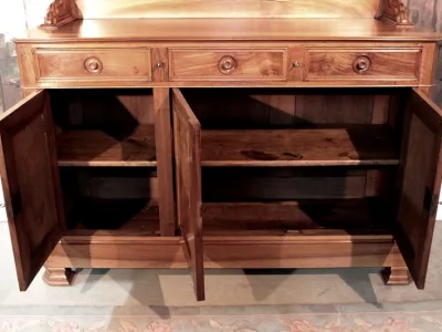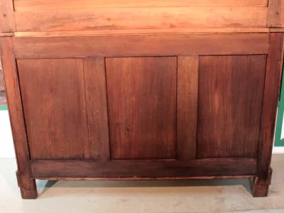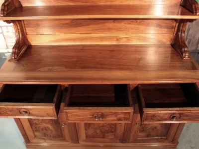 Chifonier de finales del siglo 19 en nogal que comprende tres puertas inferiores y tres cajones. Dos estantes superiores en el frontón tallado. Restaurado, despojado y pulido en nuestro taller. Perfecta condicion