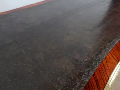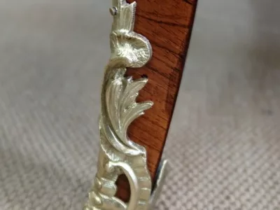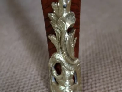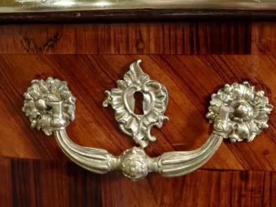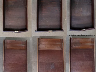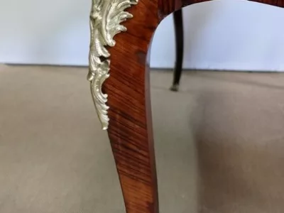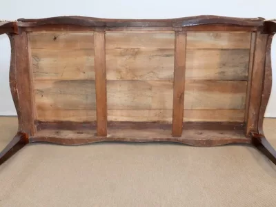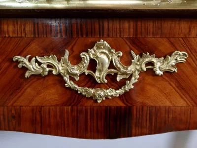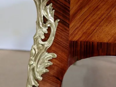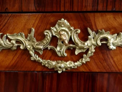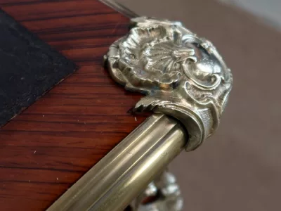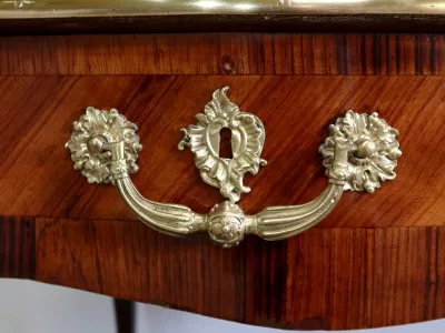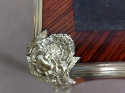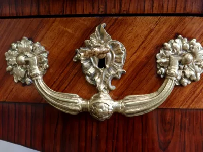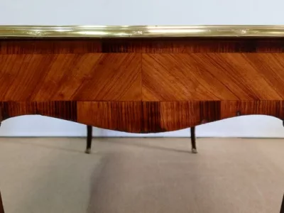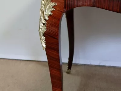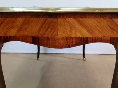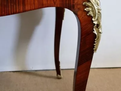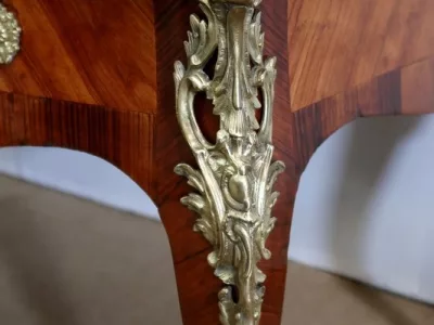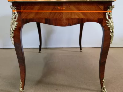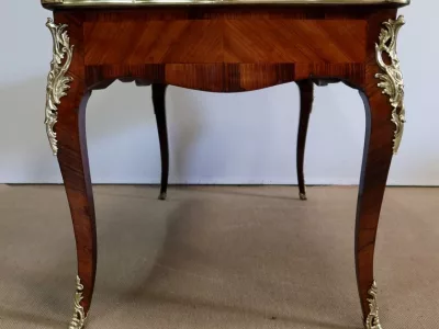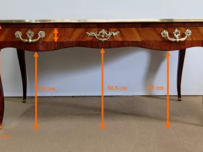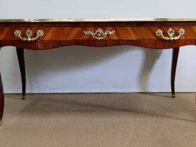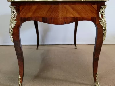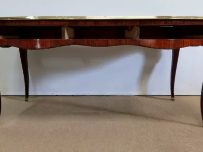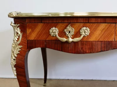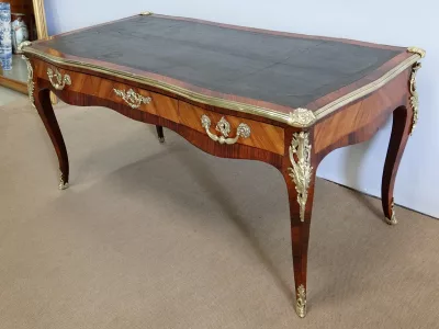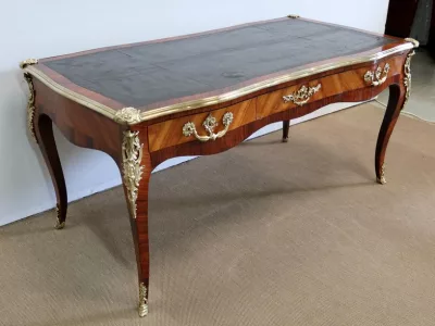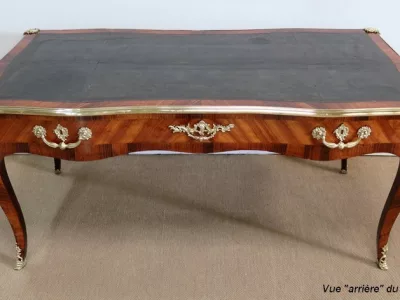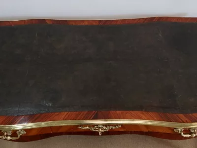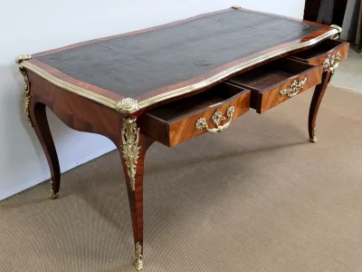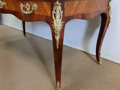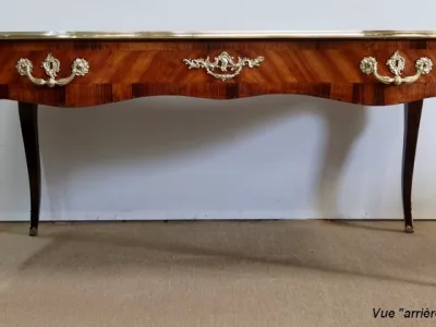 Escritorio de estilo Luis XV en palisandro y kingwood con ribete de bronce y su tapa de cuero original. Tres cajones frisos con bocallaves y tiradores de bronce y sus cerraduras y llaves originales. Imitación de cajones en la parte trasera con los mismos bronces. Finales del siglo XIX. Restaurada en nuestro taller y en excelente estado. Podemos dar un presupuesto para cambiar el cuero por pedido. Póngase en contacto con nosotros para la entrega. Referencia: 625T