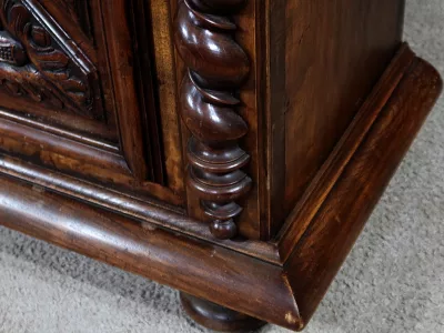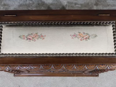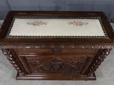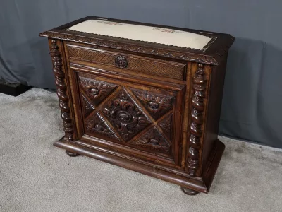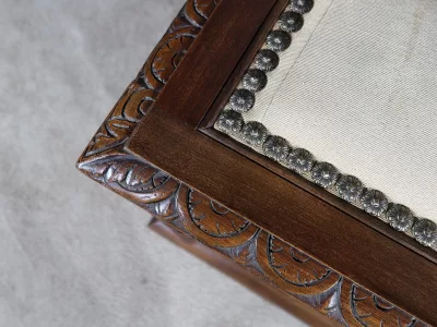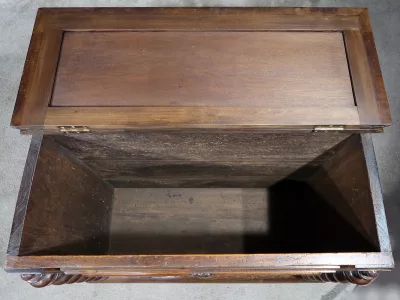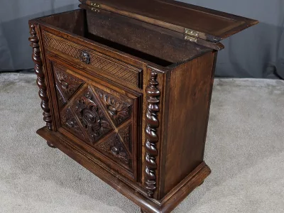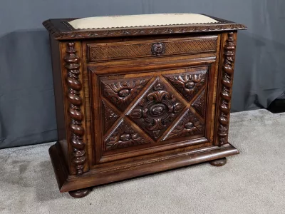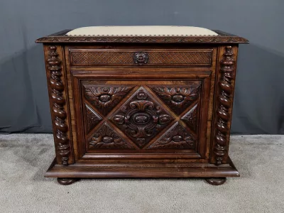 Cesto para la ropa sucia estilo Luis XIII en nogal ricamente tallado con tapa tapizada. Finales del siglo XIX. Restaurada en nuestro taller y en excelentes condiciones. Textil original. Contáctenos para la entrega.