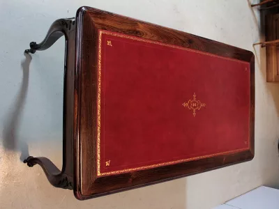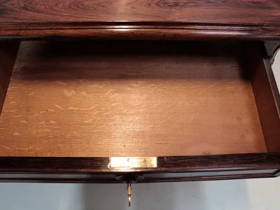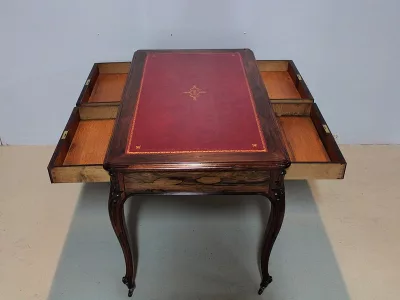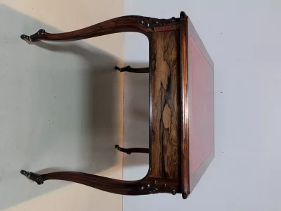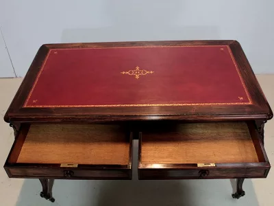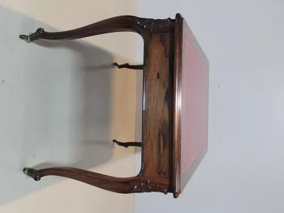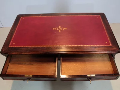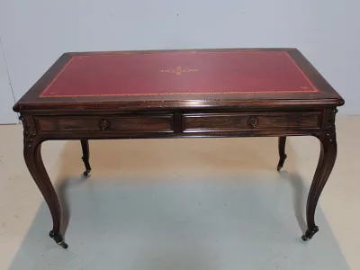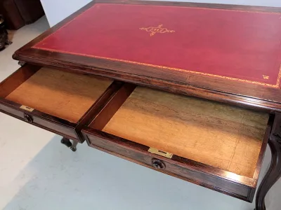 Mesa de escribir de estilo Luis XV en palo de rosa con dos cajones en cada lado. Nuevo top de cuero rojo. Espacio para piernas 63 cm. Restaurado, despojado y pulido en nuestro taller. Perfecta condicion