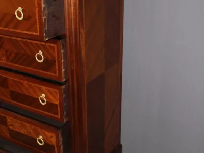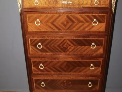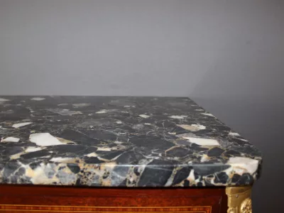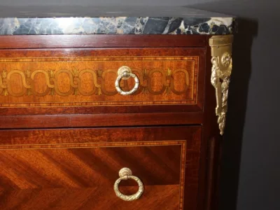 Cómoda "cajonera" de estilo Luis XVI en caoba y marquetería con tapa de mármol. Seis cajones. Circa 1925. Muy buen estado.