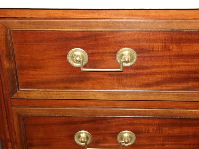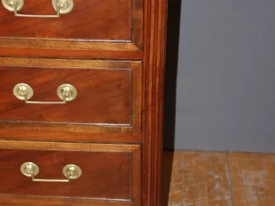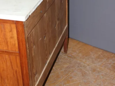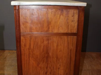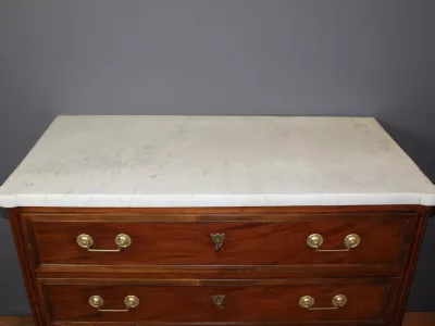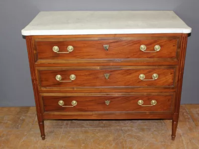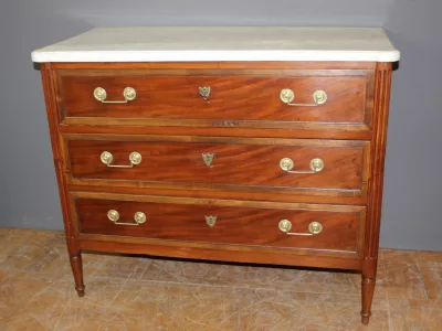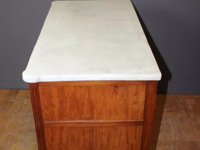 Pequeña cómoda de principios del siglo XIX, estilo Luis XVI, de madera de cerezo, con su bronce original y tapa de mármol blanco. Muy buen estado.