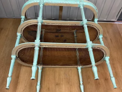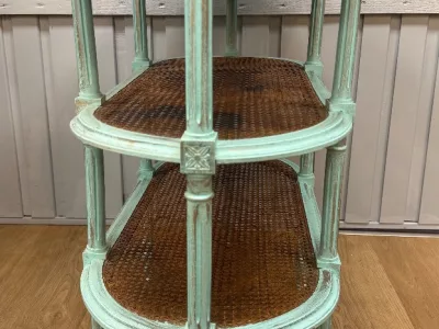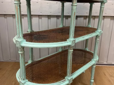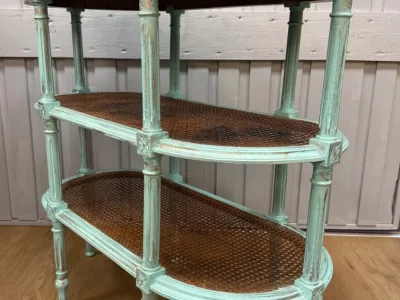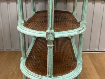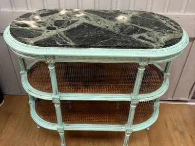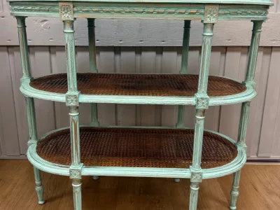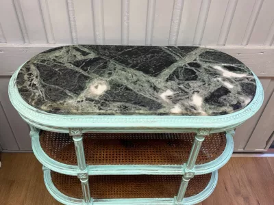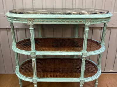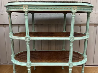 Mesa auxiliar de tres niveles de madera pintada con tablero de mármol y dos estantes inferiores de caña (en buen estado). Estilo Luis XVI. Altura entre estantes: 22 cm.