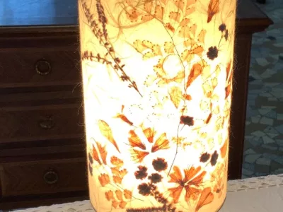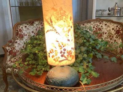 Vintage lamp in stoneware with attractive paper and dried flowers shade.