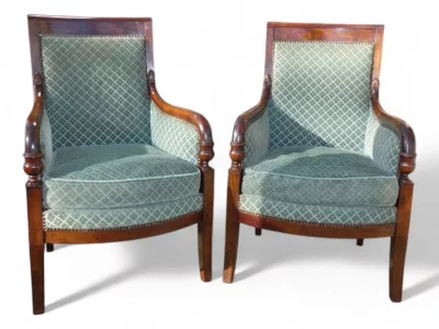 Pareja de sillones "bergère" de caoba, de la época de la Restauración, circa 1820. Altura total: 93,5 cm. Altura del asiento: 49 cm.