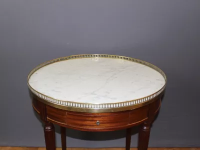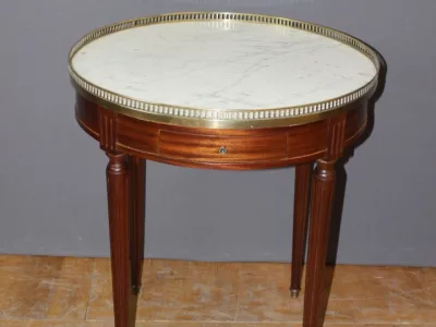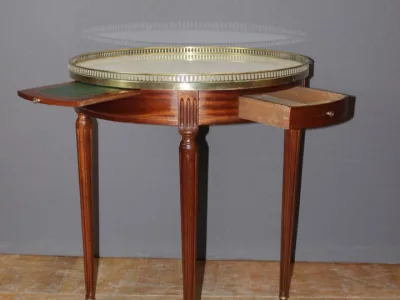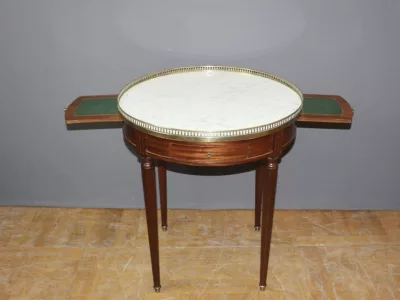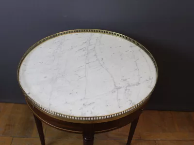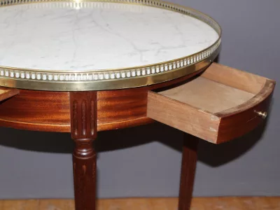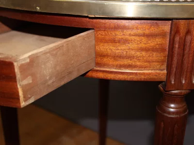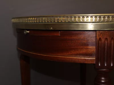 Mesa bouillotte de estilo Luis XVI en caoba con tapa de mármol y galería de latón. Dos cajones frisos y dos hojas extraíbles. Circa 1920. Muy buen estado.