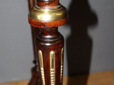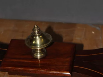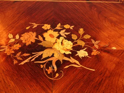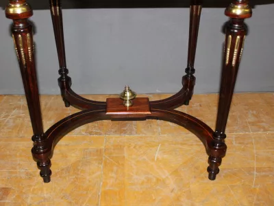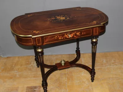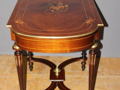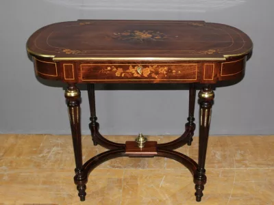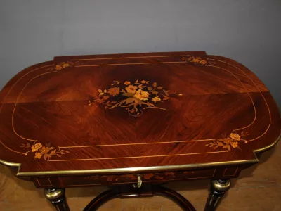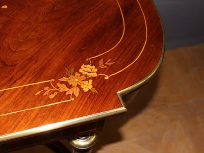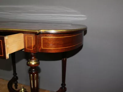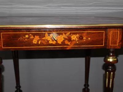 Finales del siglo XIX, estilo Luis XVI, mesa en palisandro con marquetería e incrustaciones de latón. Cajón friso. Muy buena condicion.