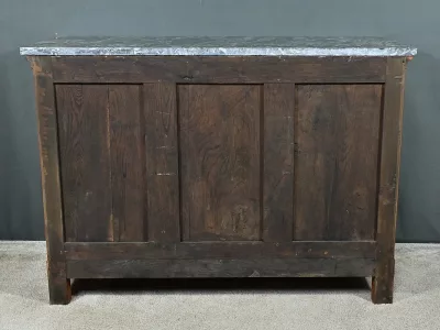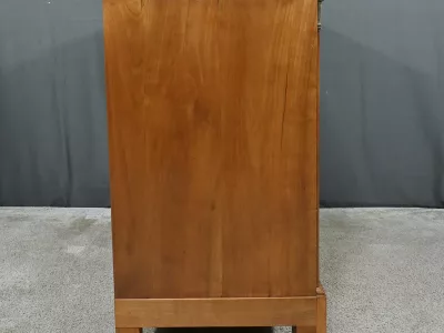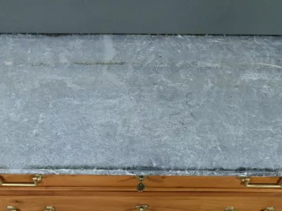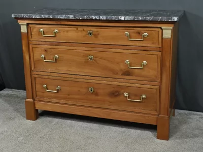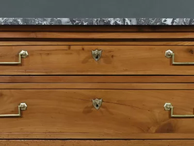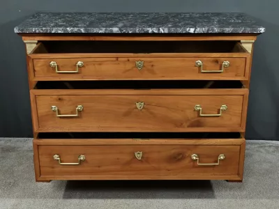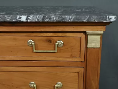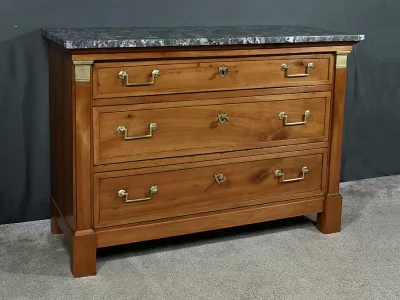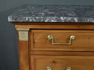 Ravissante petite commode de propriété, fabriquée en merisier et sommée d’un marbre gris belge, datant de l’époque Directoire du début du XIXe siècle. Son design raffiné et ses finitions font de cette pièce un meuble original et fonctionnel. Trois tiroirs spacieux (le plus haut est moins large) sont ornés de poignées de tirage tombantes en laiton doré et de serrures en état de fonctionnement avec entrée cœur. De chaque coté les montants sobres sont pourvus de garniture formant chapiteau en laiton qui souligne les coins supérieurs du meuble.