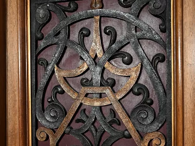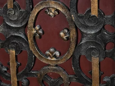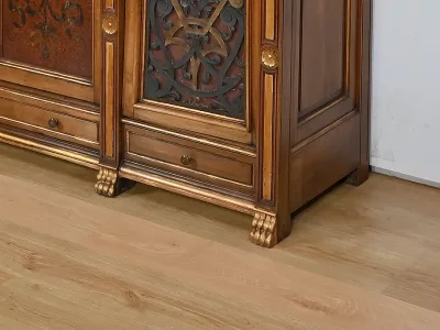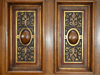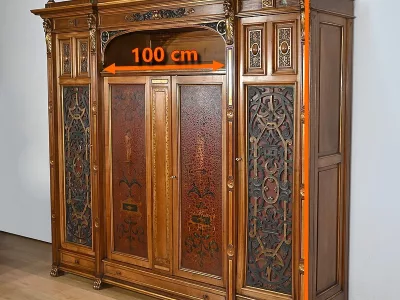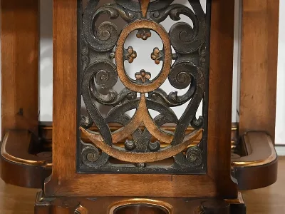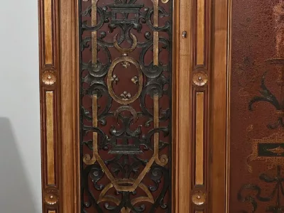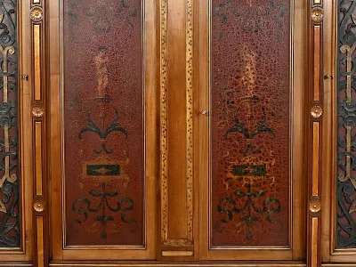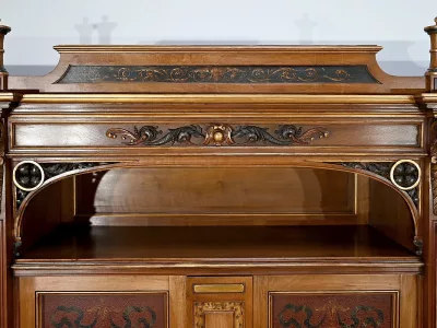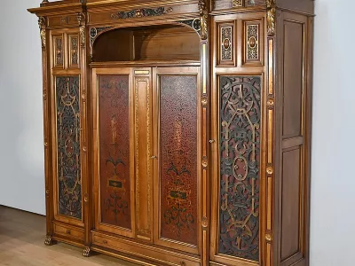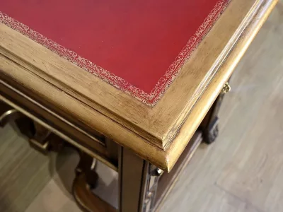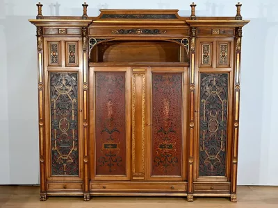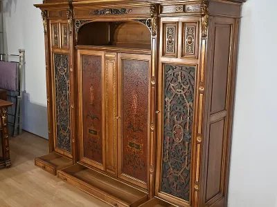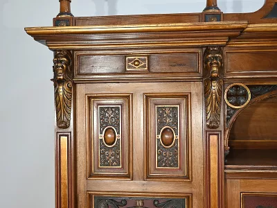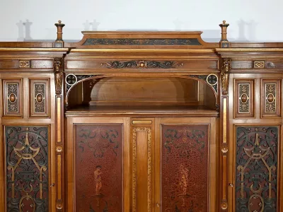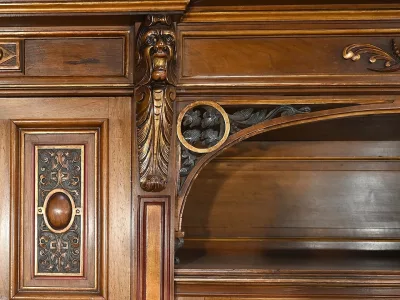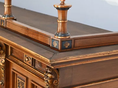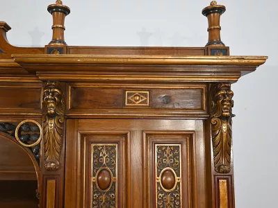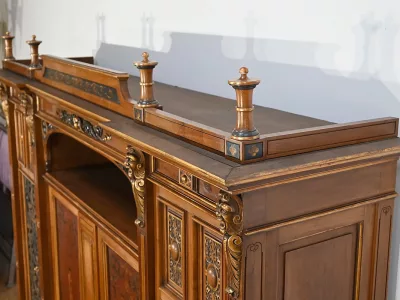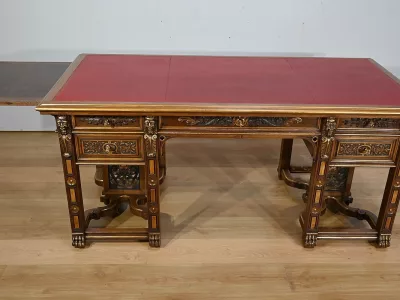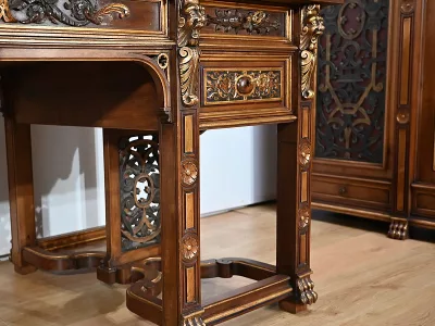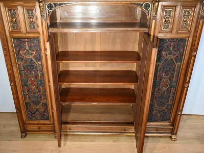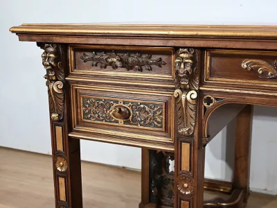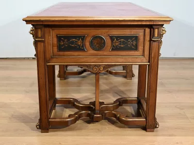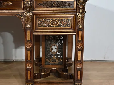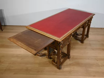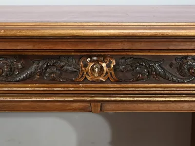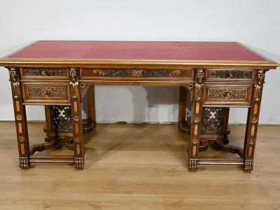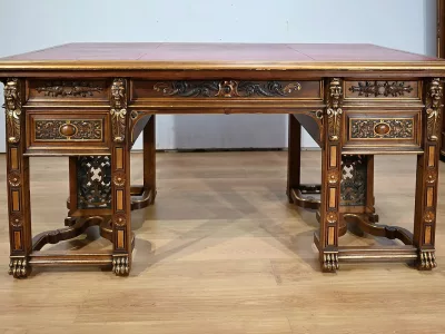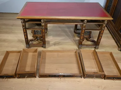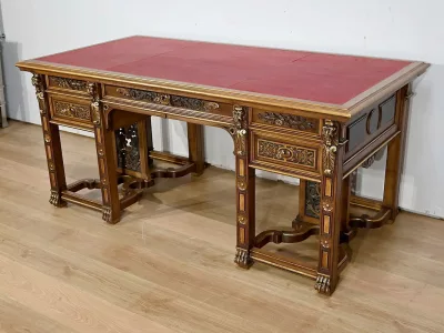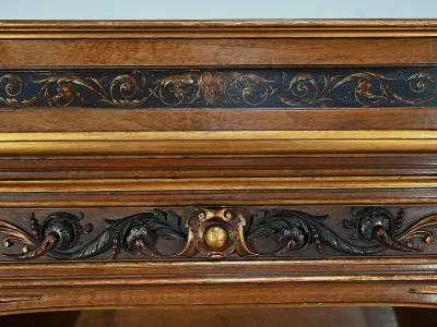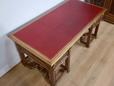 Très bel ensemble composé d’un bureau esprit Mazarin et d’un cabinet de travail. Ces meubles en noyer sont richement sculptés, dorés et peints dans le goût Renaissance italienne.