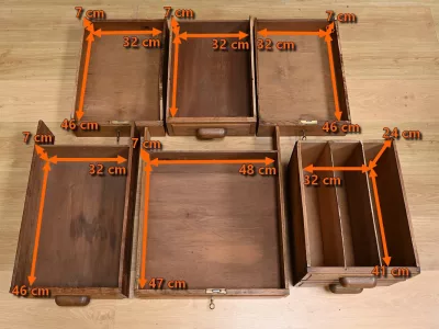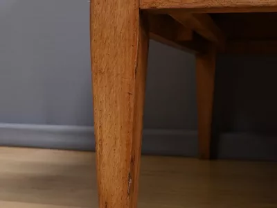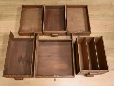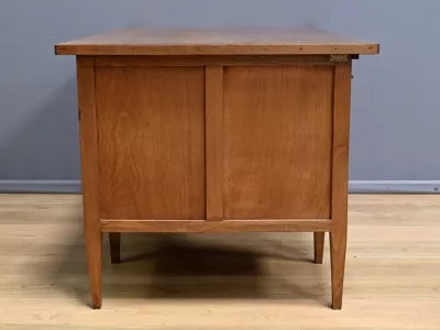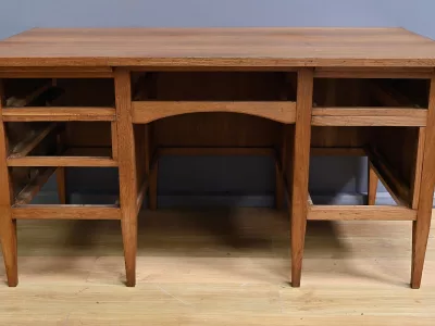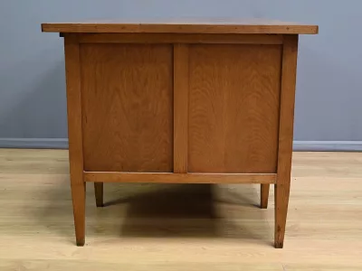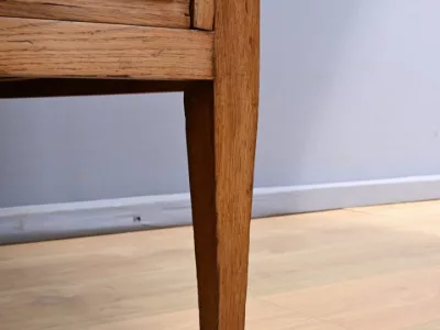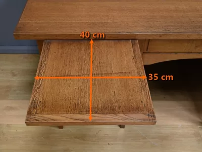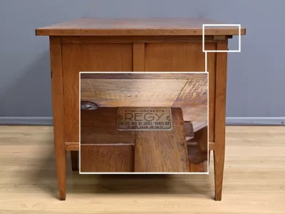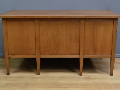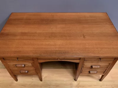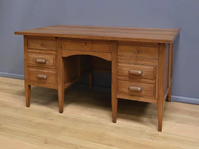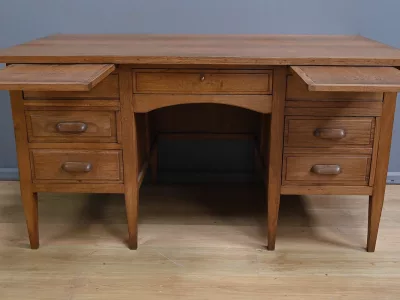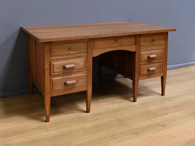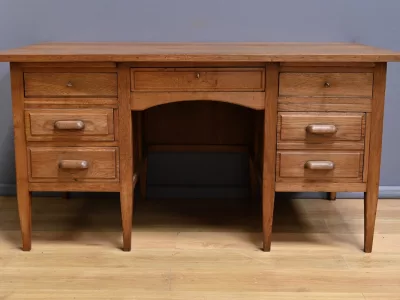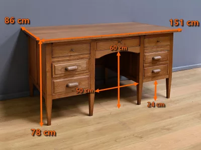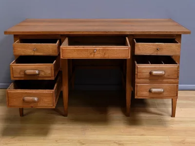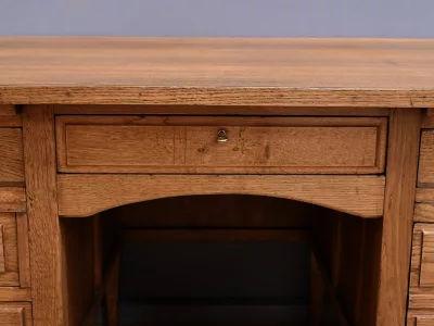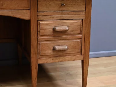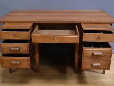 Bureau à caissons en chêne massif datant des années 1940, alliant robustesse, fonctionnalité et authenticité. Ce meuble parisien issu des établissements Régy bénéficie de 6 tiroirs spacieux, parfaits pour organiser vos documents et accessoires de bureau. Les trois tiroirs du haut sont équipés de serrures fonctionnelles accompagnées de leur clé. Les poignées en bois, les reliefs en façade et la finition naturelle mettent en valeur le grain unique du chêne. De plus, ce bureau possède des tirettes de chaque côté afin d’agrandir la surface de travail de ce bureau de milieu. La plaque des établissements Regy est positionnée sur le côté du bureau. Ses dimensions idéales pour un travail confortable et son ambiance vintage, feront de ce bureau un bel atout.