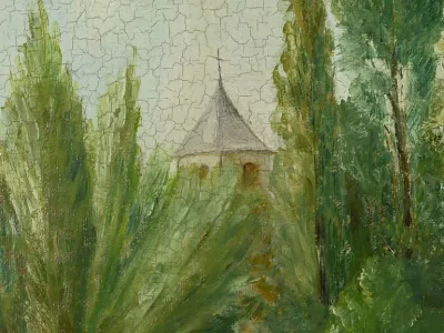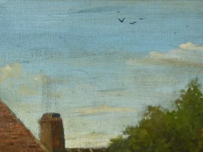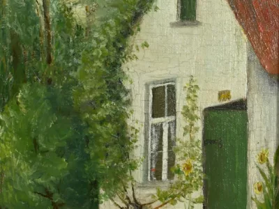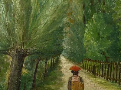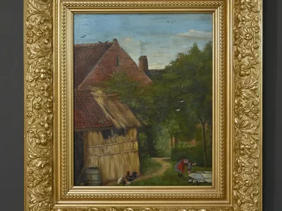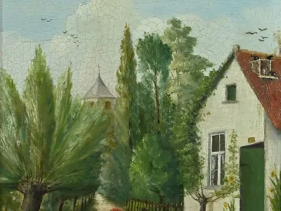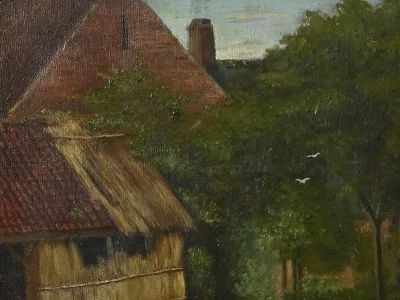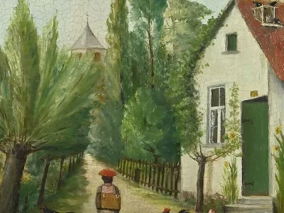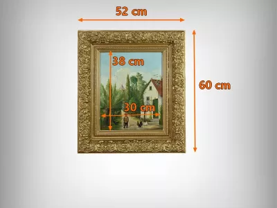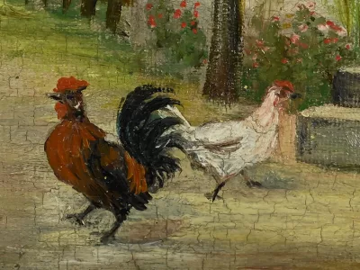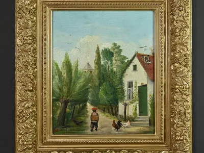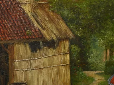 Dans ce tableau empreint de douceur, la vie rurale s’exprime avec simplicité et chaleur. Un écolier se tient debout sur un chemin de terre, entouré de poules et d’un coq qui picorent paisiblement. Sa posture tranquille, presque contemplative, suggère qu’il est chez lui dans ce décor familier, au cœur d’un village où le temps semble suspendu. La maison à ses côtés, aux murs blancs et au toit rouge, arbore une porte verte, comme une invitation à entrer dans un foyer chaleureux. Elle est nichée dans un écrin de verdure, entourée d’arbres touffus qui dansent doucement sous le ciel bleu. Quelques oiseaux volent au-dessus, ajoutant une touche de légèreté à la scène. Au loin, le clocher d’une église dépasse les feuillages. Le cadre doré, richement orné, donne à cette scène humble une noblesse discrète, comme si elle méritait d’être préservée dans la mémoire collective.