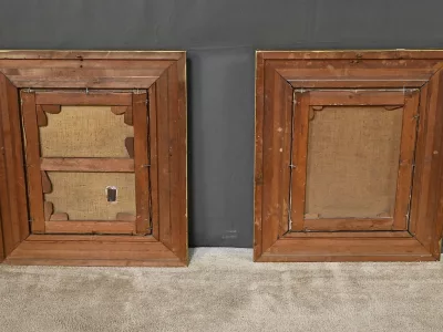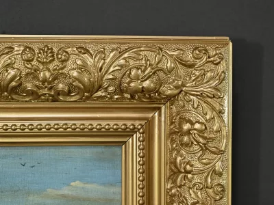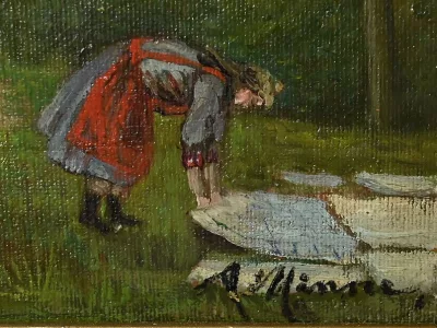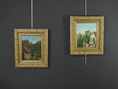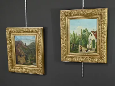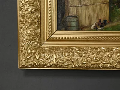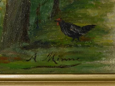 Paire de tableaux signés A. Minne représentant des scène de campagne paisibles. Le premier tableau figure un chemin de terre serpentant près d’habitations, invitant le regard à explorer les recoins de ce petit hameau. À gauche, une maison au toit en tuile évoque la simplicité et l’authenticité de la vie rurale. Non loin de là, une autre bâtisse au toit rouge apporte une touche de couleur vive à l’ensemble. Un personnage anime discrètement la scène, penché et occupé à sa tâche quotidienne. Un tonneau est posé près de la maison. Des poules picorent sur le petit chemin. La végétation est luxuriante : Les arbres, les buissons et l’herbe donnent au paysage une impression de fraîcheur et de sérénité. Le ciel, partiellement nuageux, laisse entrevoir des éclats de bleu, suggérant une journée agréable et calme. Le cadre doré, richement orné de motifs floraux et feuillagés, souligne le caractère précieux de l’œuvre. Il ajoute une dimension élégante et classique, renforçant l’idée que ce tableau est plus qu’une simple représentation : c’est une fenêtre ouverte sur un monde révolu, empreint de douceur et de nostalgie.Le deuxième tableau