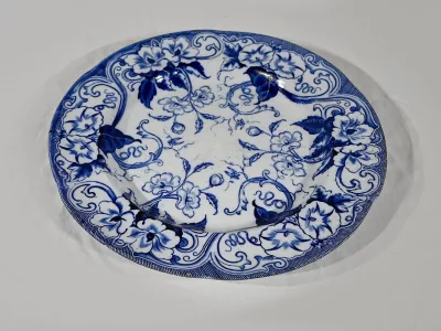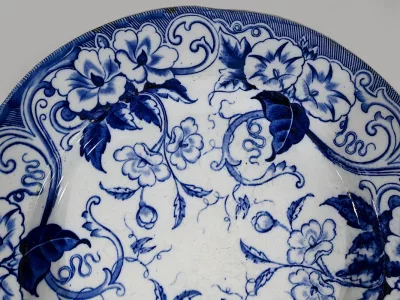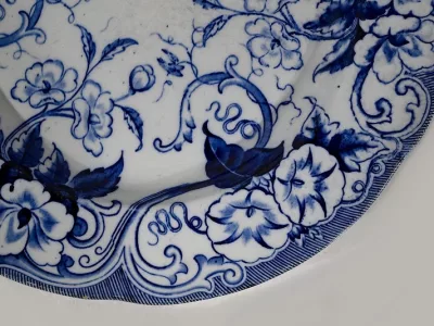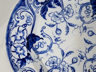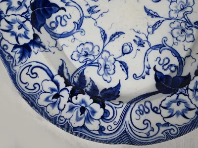 Grand plat en faïence fine à décor de fleurs, en camaïeu de bleus, issu du service « Flora aux liserons » de la Manufacture de Creil & Montereau.