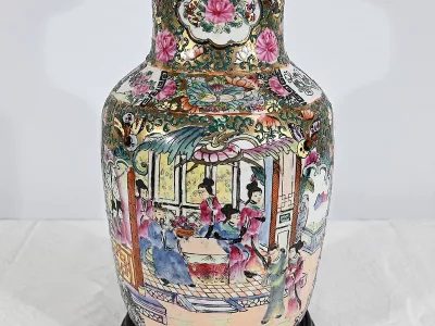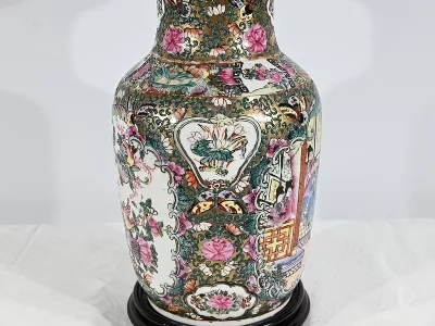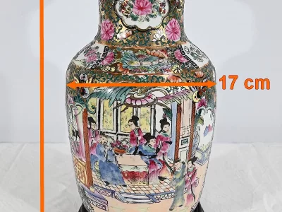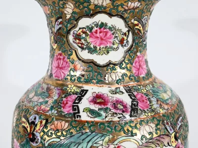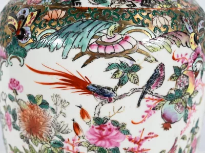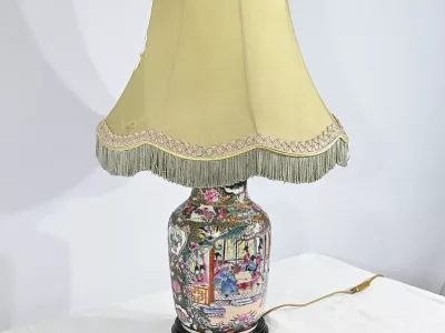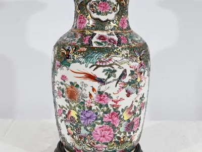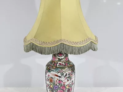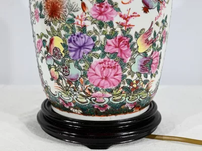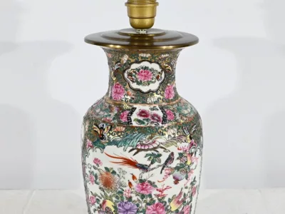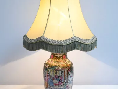 Avec son décor très gai et ses sculptures en relief rehaussées à l’or fin, cette lampe cantonnaise vous charmera par la poésie qui en émane.