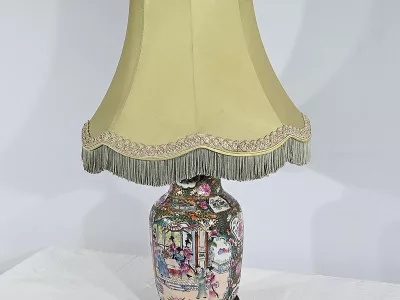 Vase balustre en porcelaine chinoise monté en lampe, richement décoré de personnages pittoresques, d’animaux, de fleurs et de feuillages. Cette Lampe est munie d’un large abat-jour à frange doté de galons, et repose sur un socle en bois noirci.