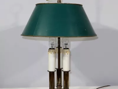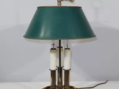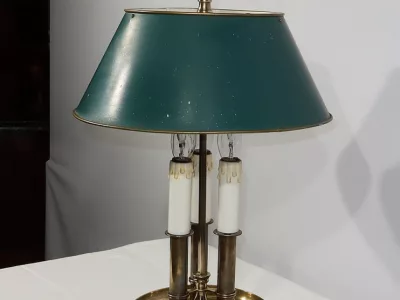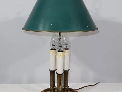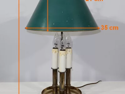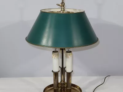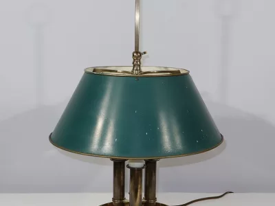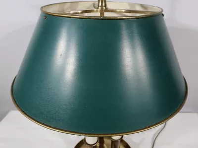 Lampe bouillotte coiffée d’un abat-jour en tôle de forme conique et laqué d’un vert empire. Cet élément, réglable en hauteur, est enjolivé sur ses extrémités hautes et basses d’un liseret doré.