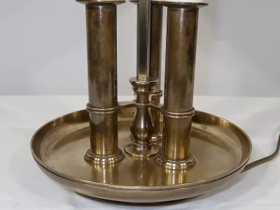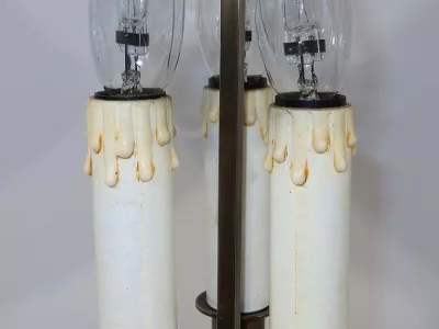 Ce bien éclaire par trois bras de lumière composé d’une feinte lumière. Ces trois porte-bougies cylindriques sont disposés en triangle sur un grand plateau en cuvette.