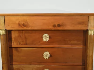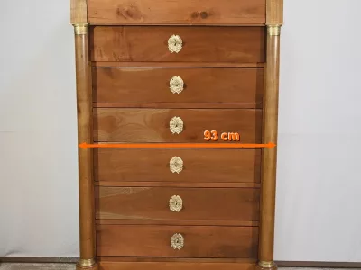 Ce meuble en merisier massif ouvre par un tiroir en ceinture et en dessous six tiroirs identiques, en retrait, de plus grandes dimensions.