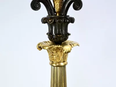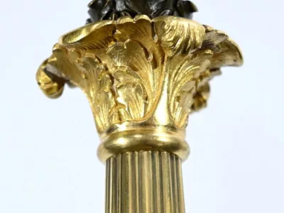 Le fut cannelé est agrémenté d’un chapiteau égyptien en partie haute, d’une base en balustre délicatement ouvragé à motif de feuille et d’une sphère striée en partie basse.