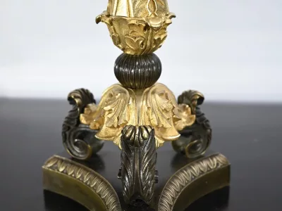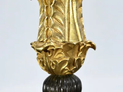 Surplombés d’un bougeoir central, trois bras de lumières, décorés de rinceaux, de volutes et de feuilles d’acanthe viennent supporter des calices aux bobèches finement ciselées.