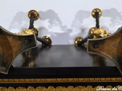 L’ensemble repose sur des pieds feuille d’acanthe en volute se terminant par un socle triangulaire dont l’arête est décorée de petites feuilles.